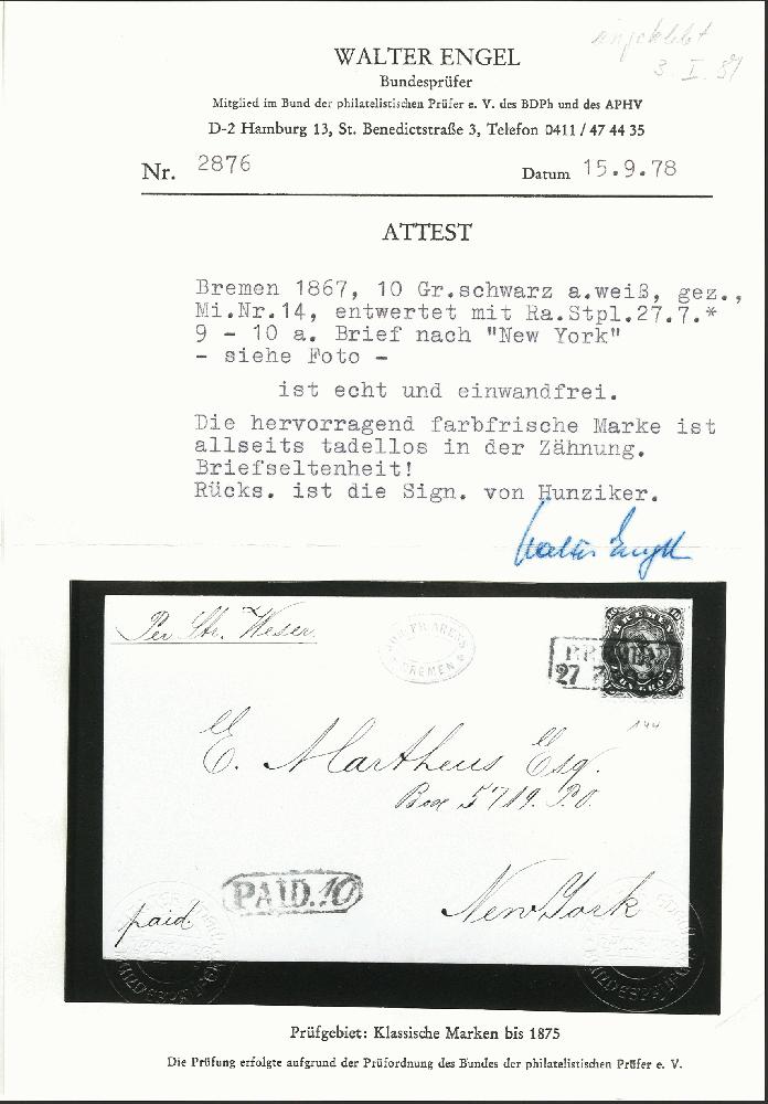 | Zusatzinformationen und Suchstichworte: | 378. Auktion Heinrich Köhler Auktionstermin 21.-26. März 2022 Los 51 10 Grote schwarz in sehr schöner tiefer und frischer Farbe, ausgabetypisch leicht unregelmäßig gezähnt, mit sauber aufgesetztem Rahmenstempel „BREMEN 27 7“ auf Briefhülle mit handschriftlichem Vermerk „Per Str. Weser“ nach New York mit nebengesetztem roten Rahmenstempel „Paid. 10“. Ein attraktiver Brief in tadelloser und ursprünglicher Erhaltung. Signiert Hunziker, Fotoattest Neumann BPP (2021) Ausruf 2.000,00 EUR Zuschlag 4.400,00 EUR (aus der Sammlung Erivan Haub) |