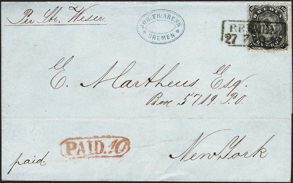 | Zusatzinformationen und Suchstichworte: | 378. Auktion Heinrich Köhler Auktionstermin 21.-26. März 2022 Los 51 10 Grote schwarz in sehr schöner tiefer und frischer Farbe, ausgabetypisch leicht unregelmäßig gezähnt, mit sauber aufgesetztem Rahmenstempel „BREMEN 27 7“ auf Briefhülle mit handschriftlichem Vermerk „Per Str. Weser“ nach New York mit nebengesetztem roten Rahmenstempel „Paid. 10“. Ein attraktiver Brief in tadelloser und ursprünglicher Erhaltung. Signiert Hunziker, Fotoattest Neumann BPP (2021) Ausruf 2.000,00 EUR Zuschlag 4.400,00 EUR (aus der Sammlung Erivan Haub) |