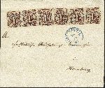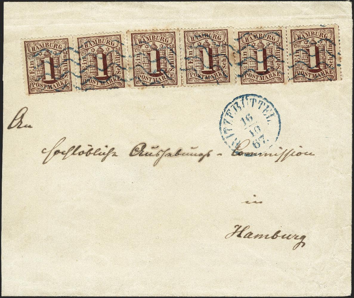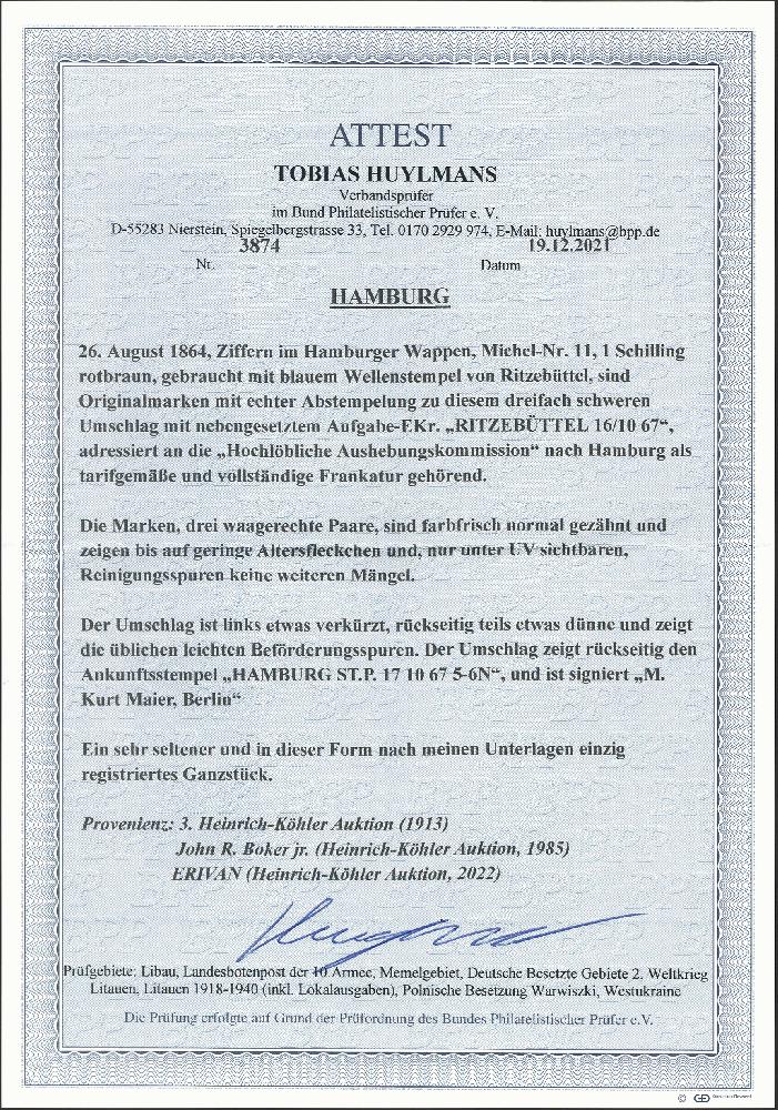 | Zusatzinformationen und Suchstichworte: | 378. Auktion Heinrich Köhler Auktionstermin 21.-26. März 2022 Los 54 1864/67, 1 Schilling braun, drei waagerechte Paare mit Vorausentwertung durch den blauen Wellenstempel von Ritzebüttel, alle farbfrisch und normal gezähnt, auf seitlich etwas verkürztem Briefkuvert der 3. Gewichtsstufe mit nebengesetztem blauem Einkreisstempel „RITZEBÜTTEL 16/10 67“ an die Aushebungs-Kommission in Hamburg mit Ankunftsstempel vom nächsten Tag. Die Frankatur geringe Altersfleckchen, sonst einwandfrei. Der Wellenstempel von Ritzebüttel ist fast ausschließlich auf dem 2 Schilling-Wert bekannt, wir haben nur zwei weitere Briefe mit 1 Schilling-Werten registriert, dies ist jedoch die höchste bekannte Frankatur mit dem Wellenstempel. Signiert Kurt Maier, Berlin und Fotoattest Huylmans BPP (2021) Ausruf 3.000,00 EUR Zuschlag 6.000,00 EUR (aus der Sammlung Erivan Haub) |