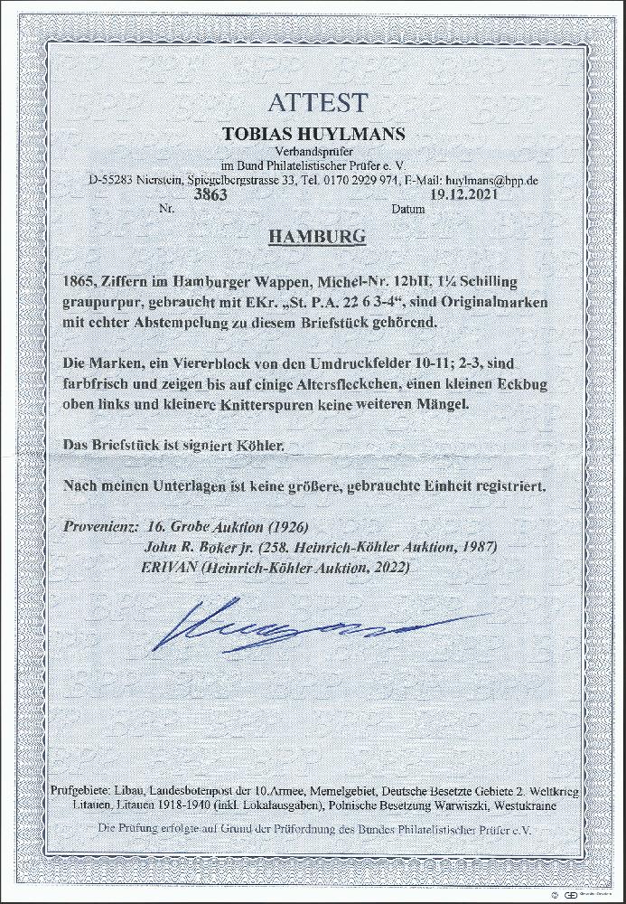 | Zusatzinformationen und Suchstichworte: | 378. Auktion Heinrich Köhler Auktionstermin 21.-26. März 2022 Los 55 1864/67, 1¼ Schilling graupurpur im Viererblock der Umdruckfelder 10-11 und 2-3, farbfrisch und gut gezähnt, mit sauber aufgesetztem Einkreisstempel „St.P.A. 22 6“ auf Briefstück. Leichte Altersfleckchen und Aufkleberknitter sowie kleine Eckbugspur oben links, sonst einwandfrei. Größte registrierte gebrauchte Einheit dieser Marke. Signiert Köhler und Fotoattest Huylmans BPP (2021) Ausruf 500,00 EUR Zuschlag 700,00 EUR (aus der Sammlung Erivan Haub) |