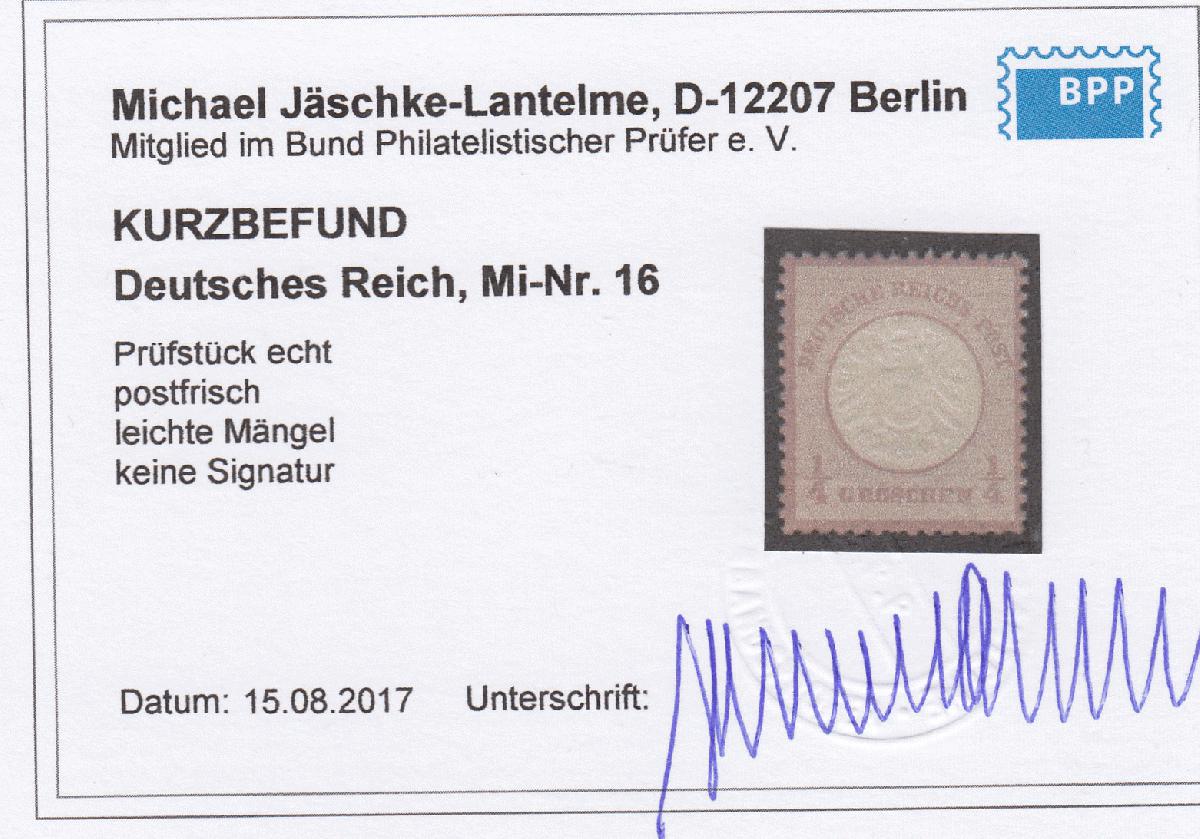 | Prüfer: | Jäschke-Lantelme, Michael (BPP (Bund Philatelistischer Prüfer)) |