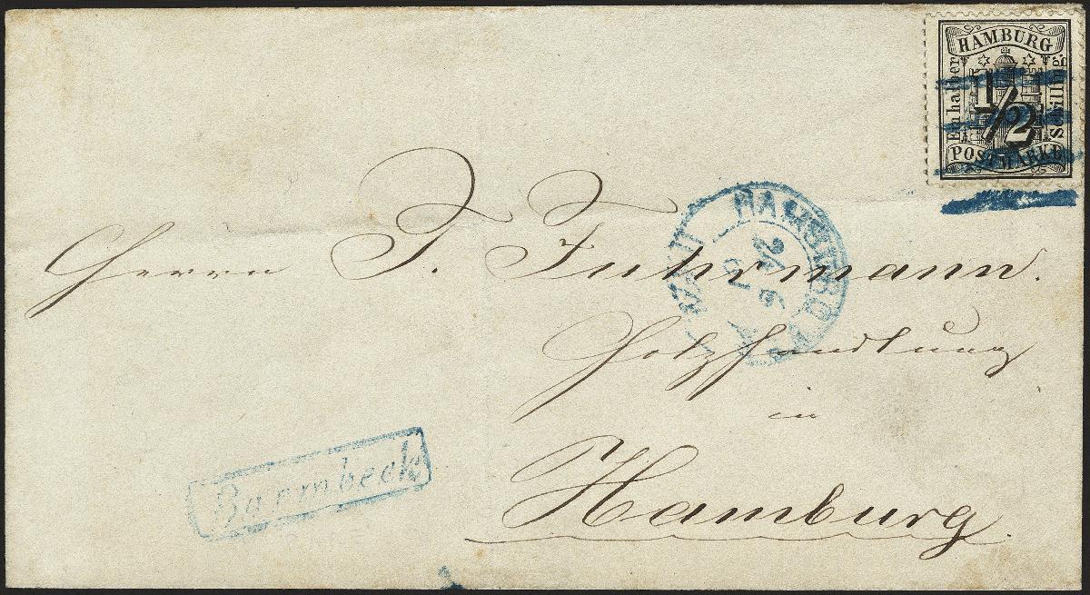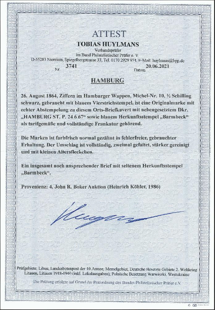| Zusatzinformationen und Suchstichworte: | 378. Auktion Heinrich Köhler Auktionstermin 21.-26. März 2022 Los 57 ½ Schilling schwarz, farbfrisch und üblich gezähnt mit sauber aufgesetztem blauem Balkenstempel und nebengesetztem blauem Herkunftsstempel „Barmbeck“ sowie Doppelkreisstempel „HAMBURG St. P. 24 6 67“ auf Briefkuvert nach Hamburg. Das Kuvert ist unauffällig gefaltet und wurde gereinigt, sonst einwandfrei. Fotoattest Huylmans BPP (2021) Ausruf 300,00 EUR Zuschlag 540,00 EUR (aus der Sammlung Erivan Haub) |