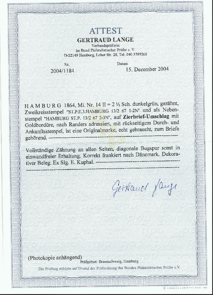 | Zusatzinformationen und Suchstichworte: | 378. Auktion Heinrich Köhler Auktionstermin 21.-26. März 2022 Los 58 2½ Schilling grün, farbfrisch und üblich gezähnt mit sauber auf- und nebengesetztem blauem Doppelkreisstempel „ST.P.E. 3 HAMBURG 13/2 67“ sowie zusätzlichem „HAMBURG St. P.“ auf kleinem Briefkuvert mit geprägter und mit Gold bedruckter Zierborde nach Randers in Dänemark mit rückseitigen Bahnpost-und Ankunftsstempeln. Die Marke unauffällige kleine Bugspur und das Kuvert übliche geringe Altersspuren, sonst einwandfreie und attraktive Erhaltung. Es sind nur wenige Zierbriefe von Hamburg bekannt. Fotoatteste Lange BPP (2004) und Huylmans BPP (2021) Ausruf 500,00 EUR Zuschlag 2.400,00 EUR (aus der Sammlung Erivan Haub) |