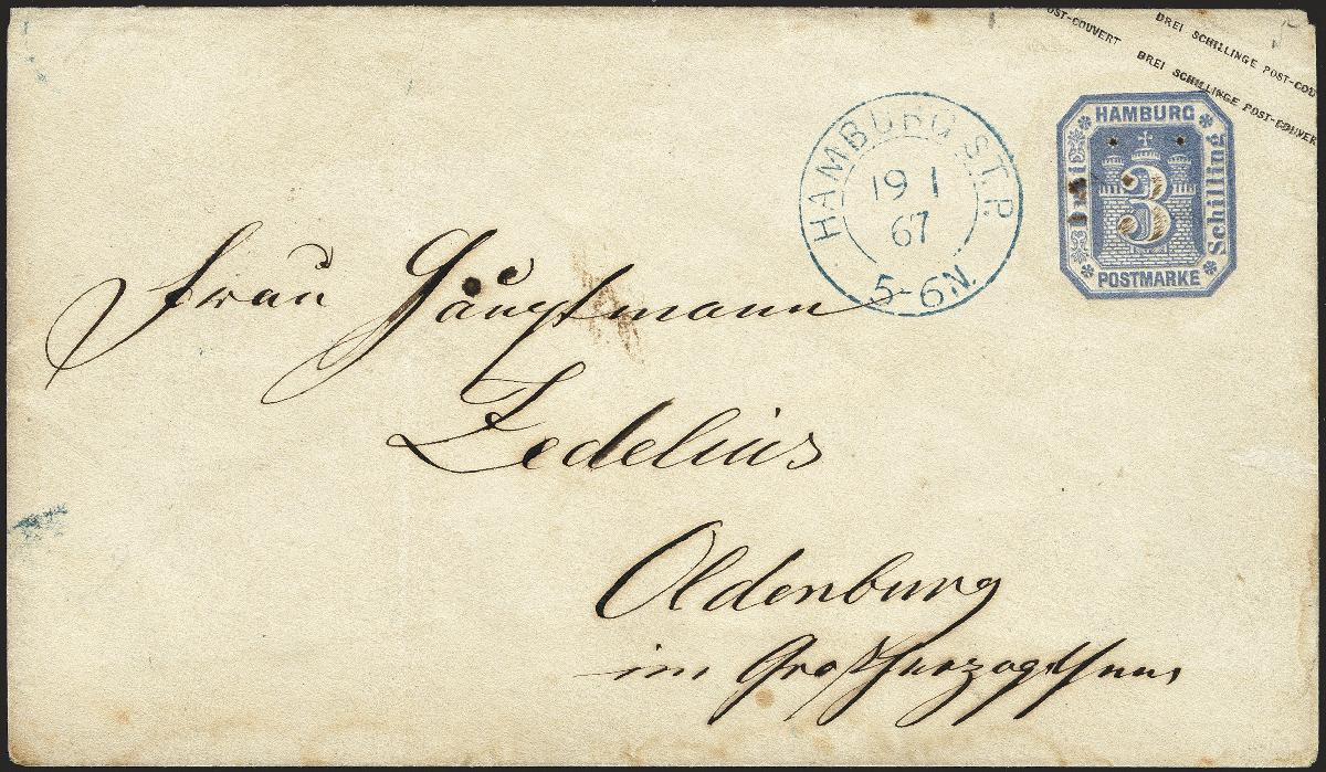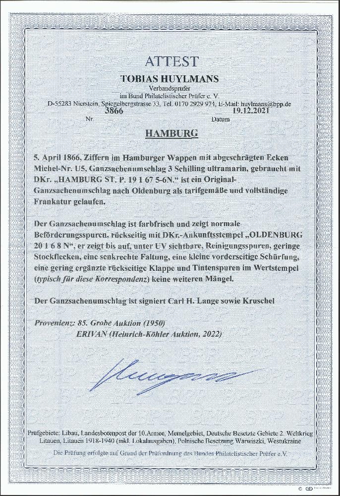 | Zusatzinformationen und Suchstichworte: | 378. Auktion Heinrich Köhler Auktionstermin 21.-26. März 2022 Los 61 Umschlag 3 Schilling ultramarin mit sauber nebengesetztem blauen Doppelkreisstempel „HAMBURG ST.P. 19 1 67“ nach Oldenburg mit Ankunftsstempel. Leichte senkrechte Faltung außerhalb des Wertstempels und übliche leicht Beförderungsspuren, kleiner Teil der Rückklappe ergänzt und für diese Korrespondenz übliche leichte Tintenspuren im Wertstempel. Signiert Kruschel und Carl H. Lange, Fotoattest Huylmans BPP (2021) Ausruf 300,00 EUR Zuschlag 480,00 EUR (aus der Sammlung Erivan Haub) |