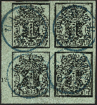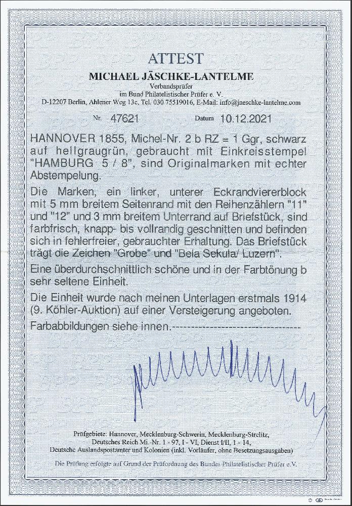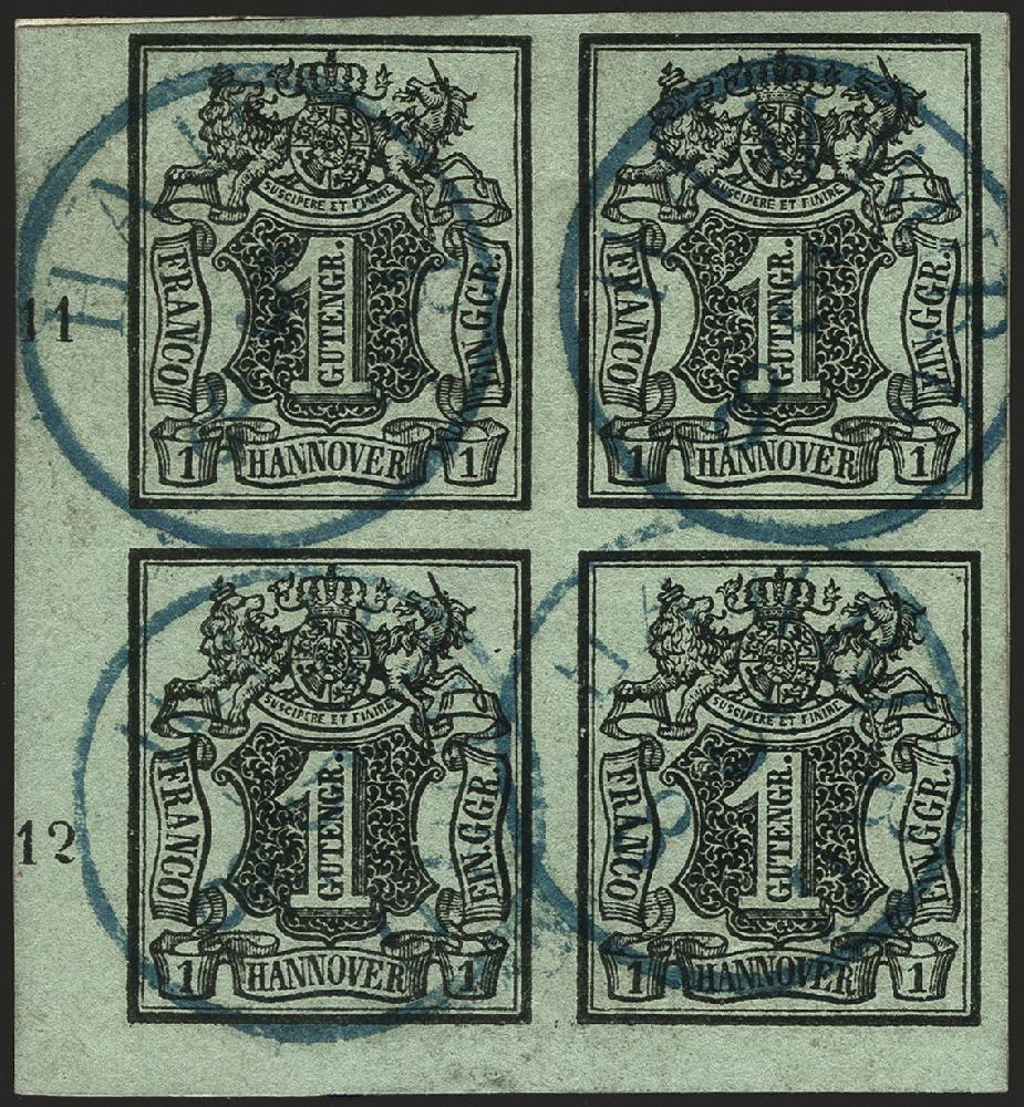 | Zusatzinformationen und Suchstichworte: | 378. Auktion Heinrich Köhler Auktionstermin 21.-26. März 2022 Los 67 1851/55, Wappen 1 Gutegroschen schwarz auf meergrün im Viererblock aus der linken unteren Bogenecke, farbfrisch und allseits breitrandig mit ca. 3/5 mm Bogenrändern (links Reihenzähler „11“ und „12“), mit auf jeder Marke einzelnen sauber abgeschlagenem blauen Einkreisstempel „HAMBURG 5/8“ auf kleinem Briefstück. Ein sehr schöner und seltener Block in tadelloser Erhaltung; wir haben keinen weiteren Viererblock der b-Farbe registriert. Signiert Grobe und Bela Sekula, Fotoattest Jäschke-Lantelme BPP (2021) Ausruf 2.000,00 EUR Zuschlag 7.500,00 EUR (aus der Sammlung Erivan Haub) |