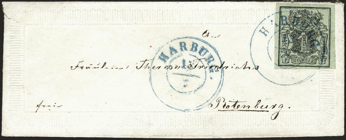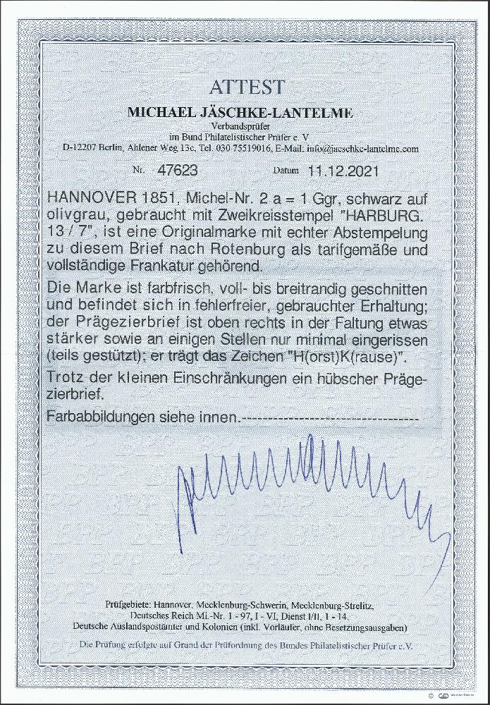 | Zusatzinformationen und Suchstichworte: | 378. Auktion Heinrich Köhler Auktionstermin 21.-26. März 2022 Los 68 1 Gutegroschen schwarz auf graugrün, farbfrisch und voll- bis meist breitrandig, mit sauber auf- und nebengesetztem Doppelkreisstempel „HARBURG 13/7“ auf kleinem Damenbrief mit farblos geprägter Zierborde nach Rotenburg. Die Marke einwandfrei, im Umschlag meist unauffällige kleine Randrisse, die Rückklappe etwas angetrennt. Signiert Krause und Fotoattest Jäschke-Lantelme BPP (2021) Ausruf 200,00 EUR Zuschlag 340,00 EUR (aus der Sammlung Erivan Haub) |