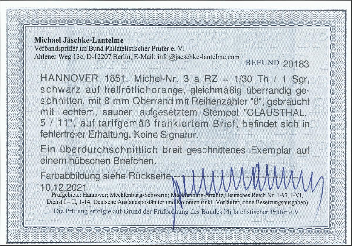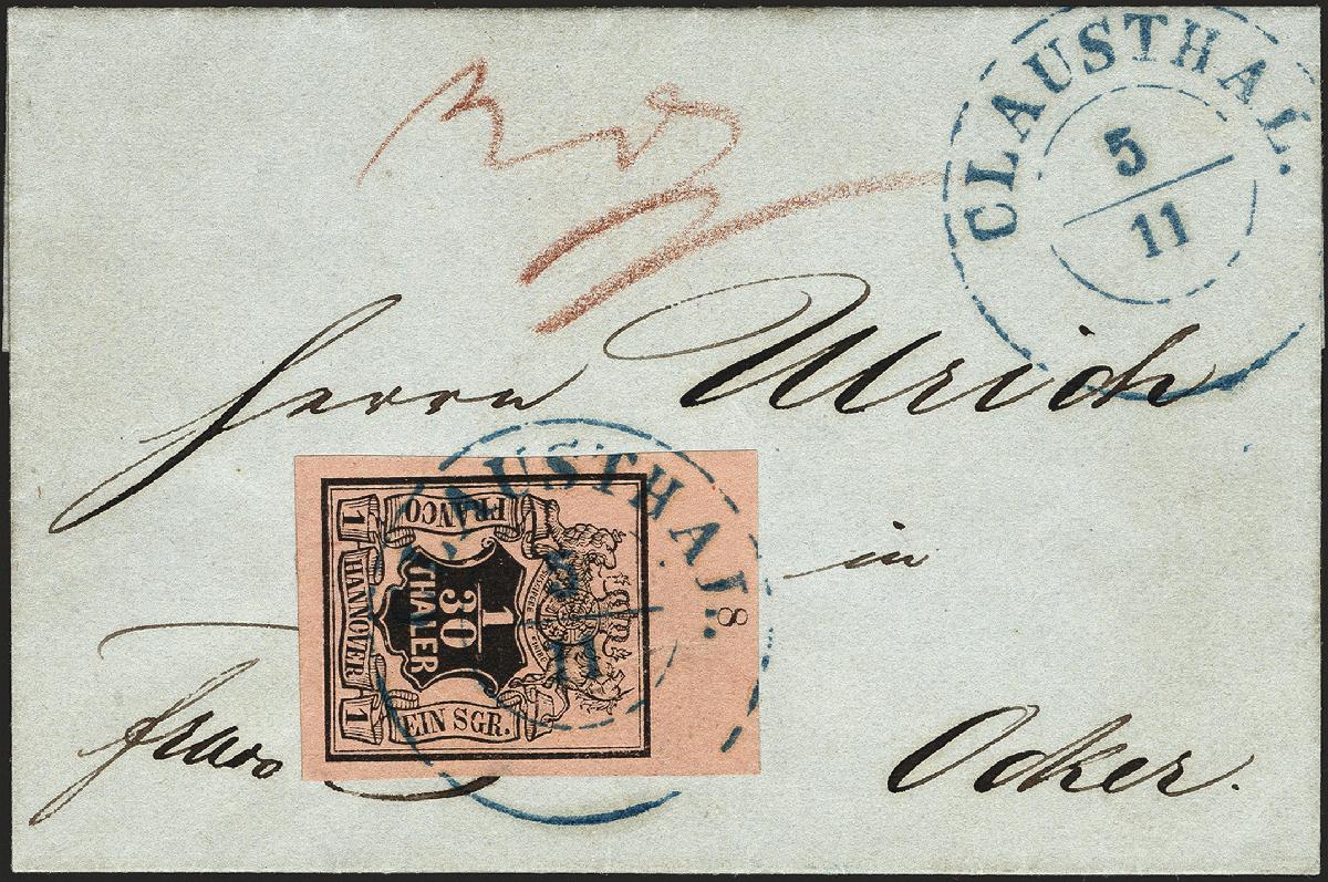 | Zusatzinformationen und Suchstichworte: | 378. Auktion Heinrich Köhler Auktionstermin 21.-26. März 2022 Los 71 1851/55, 1/30 Taler schwarz auf Lachsfarben, allseits breitbandiges Oberrandstück mit ca. 8 mm Bogenrand mit Reihenzähler „8“, mit sauber auf-und nebengesetztem Doppelkreisstempel „CLAUSTHAL 5/11“ auf kleiner Briefhülle nach Oker in Braunschweig mit vorderseitig in Rötel notiertem Bestellgeld von 3 Pfennig. Kabinett. Fotobefund Jäschke-Lantelme BPP. Ausruf 150,00 Zuschlag 1.500,00 EUR (aus der Sammlung Erivan Haub) |