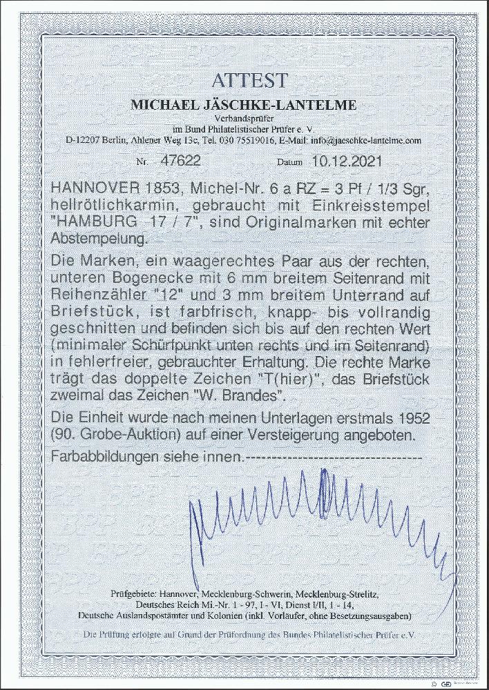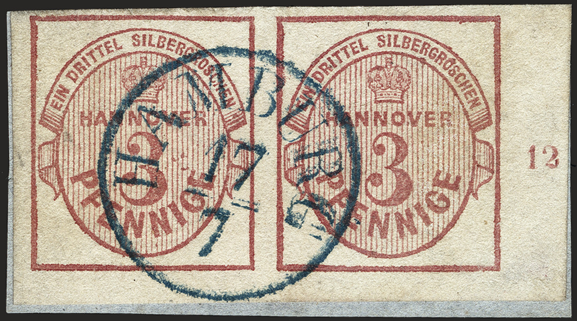 | Zusatzinformationen und Suchstichworte: | 378. Auktion Heinrich Köhler Auktionstermin 21.-26. März 2022 Los 73 3 Pfennig hellrötlichkarmin im waagerechten Paar aus der rechten unteren Bogenecke, sehr schön farbfrisch und voll- bis breitrandig mit ca. 3/6 mm Bogenrändern, rechts mit Reihenzähler“12“, mit klar aufgesetztem blauem Einkreisstempel „HAMBURG 17/7“ auf kleinem Briefstück. Der rechte Wert mit minimalen Schürftpunkten unten rechts und im Seitenrand, sonst tadellos. Signiert W. Brandes und Thier, Fotoattest Jäschke-Lantelme BPP (2021) Ausruf 800,00 EUR Zuschlag 1.900,00 EUR (aus der Sammlung Erivan Haub) |