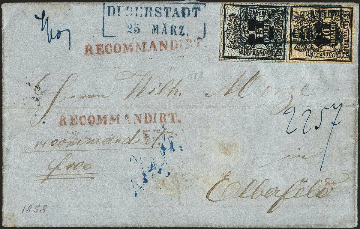 | Zusatzinformationen und Suchstichworte: | 378. Auktion Heinrich Köhler Auktionstermin 21.-26. März 2022 Los 78 1/15 Taler grauultramarin genetzt und 1/10 Taler orangegelb genetzt, beide farbfrisch und vollrandig, mit sauber auf- und nebengesetztem Rahmenstempel „DUDERSTADT 25 MÄRZ“ auf komplettem Charge-Brief mit zweimal nebengesetztem roten Langstempel „RECOMMANDIRT“ nach Elberfeld. Leichte Altersfleckchen, sonst tadellos. Eine seltene Farbfrankatur. Fotoattest Jäschke-Lantelme BPP (2021) Ausruf 400,00 EUR Zuschlag 420,00 EUR (aus der Sammlung Erivan Haub) |