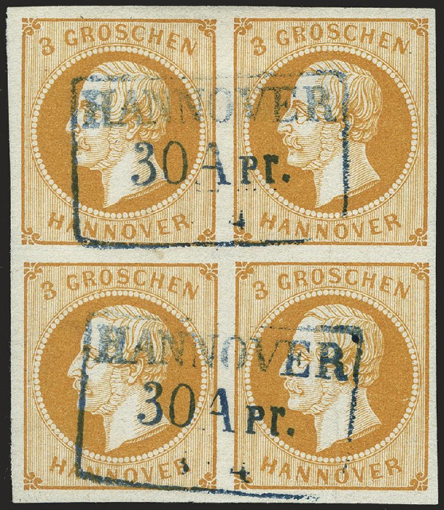| Zusatzinformationen und Suchstichworte: | 378. Auktion Heinrich Köhler Auktionstermin 21.-26. März 2022 Los 82 3 Groschen schwärzlichgelborange im Viererblock, farbfrisch und voll- bis breitrandig, sauber entwertet durch paarweise aufgesetzten blauen Rahmenstempel „HANNOVER 30 Apr.“. Das rechte senkrechte Paar unauffällig geglätteter Bug, sonst einwandfrei. Fotobefund Jäschke-Lantelme BPP (2021) Ausruf 100,00 EUR Zuschlag 360,00 EUR (aus der Sammlung Erivan Haub) |