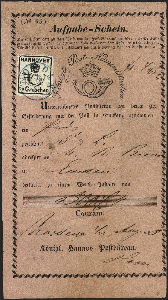 | Zusatzinformationen und Suchstichworte: | 378. Auktion Heinrich Köhler Auktionstermin 21.-26. März 2022 Los 87 ½ Groschen schwarz, farbfrisch und gut durchstochen, mit klar aufgesetztem blauen Einkreisstempel „NORDEN 4/8“ auf Einlieferungsschein für eine Wertsendung nach Emden. Die Marke einwandfrei, das Formular leicht fleckig, mit üblichen Bügen und kleiner Schürfung. Es sind nur wenige frankierte Postscheine von Hannover registriert. Fotoattest Jäschke-Lantelme BPP (2021) Ausruf 500,00 EUR Zuschlag 900,00 EUR (aus der Sammlung Erivan Haub) |