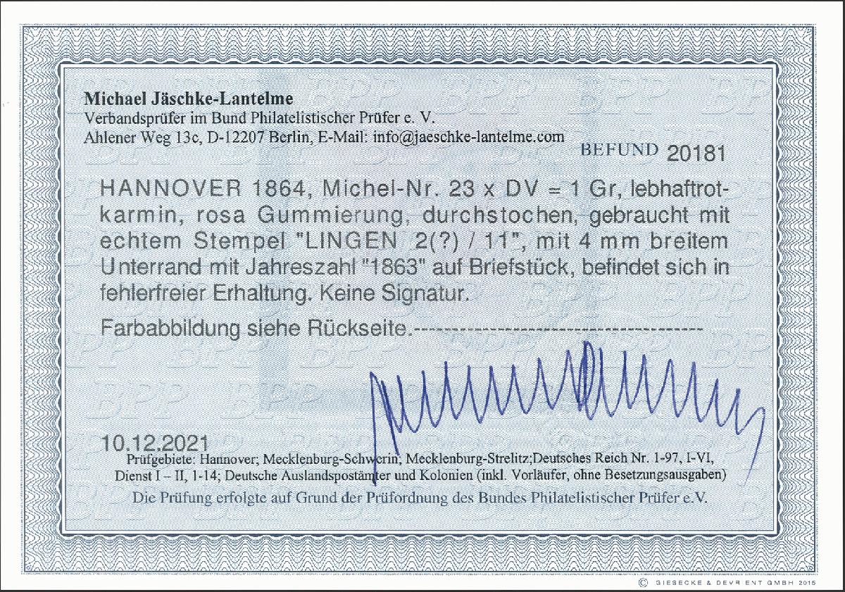 | Prüfer: | Jäschke-Lantelme, Michael (BPP (Bund Philatelistischer Prüfer)) |