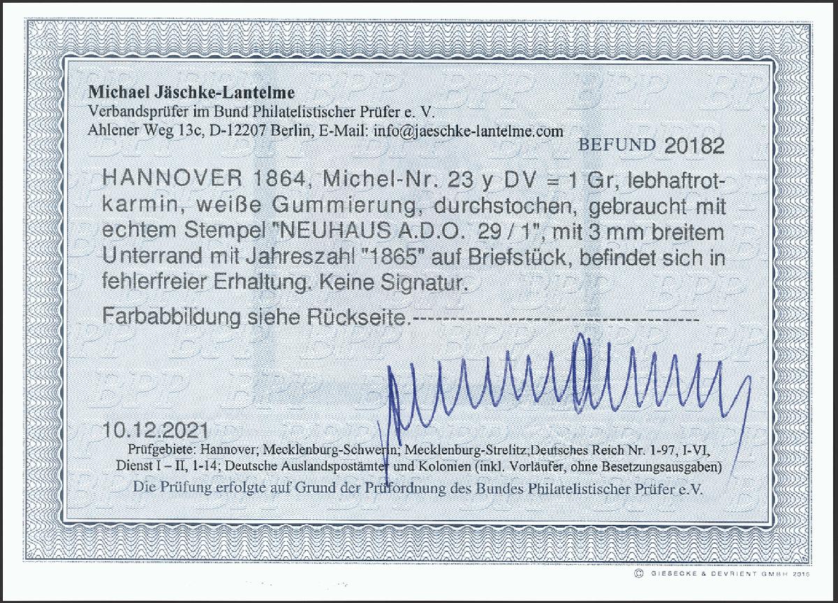 | Prüfer: | Jäschke-Lantelme, Michael (BPP (Bund Philatelistischer Prüfer)) |