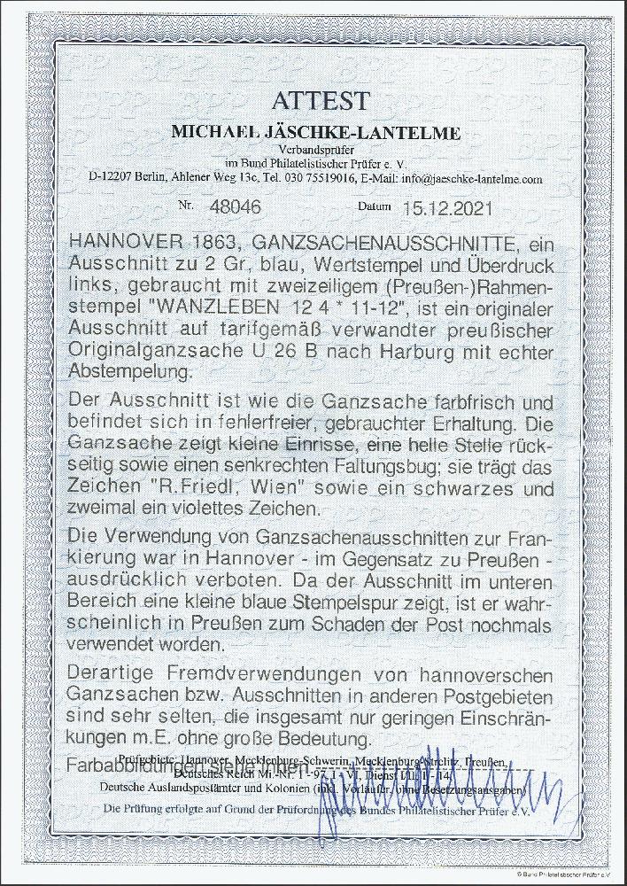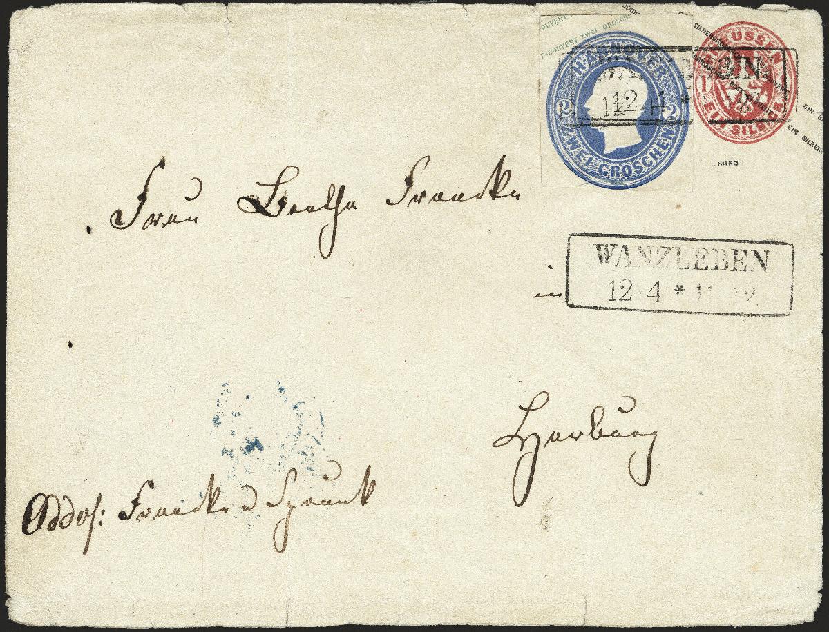 | Zusatzinformationen und Suchstichworte: | 378. Auktion Heinrich Köhler Auktionstermin 21.-26. März 2022 Los 91 1863, Ganzsachenausschnitt 2 Groschen blau, viereckig geschnitten, als Zufrankatur auf Preußen Ganzsachenumschlag 1863, 1 Groschen rosa im Großformat, mit übergehend auf- und zusätzlich nebengesetztem preußischen Rahmenstempel „WANZLEBEN 12 4“ nach Harburg mit Ankunftsstempel vom nächsten Tag. Die Ganzsache kleine Randrisse, unauffällige senkrechte Faltung und rückseitig eine kleine helle Stelle, sonst einwandfrei. Der Ausschnitt zeigt unten eine kleine blaue Stempelspur, wurde also höchstwahrscheinlich zum Schaden der Post wiederverwendet. Im Gegensatz zu Preußen waren Ganzsachenausschnitt in Hannover zur Frankierung ausdrücklich verboten, da sie hier generell nicht entwertet wurden. Eine ungemein seltene, unbeanstandet beförderte Mischfrankatur und einer von nur drei von uns registrierten Briefen mit einem Ganzsachenausschnitt Hannovers. Signiert Friedl, Wien und Fotoattest Jäschke-Lantelme BPP (2021) Provenienz: Sammlung Rothschild, John Boker jr. (1999) Ausruf 5.000,00 EUR Zuschlag 5.000,00 EUR (aus der Sammlung Erivan Haub) |