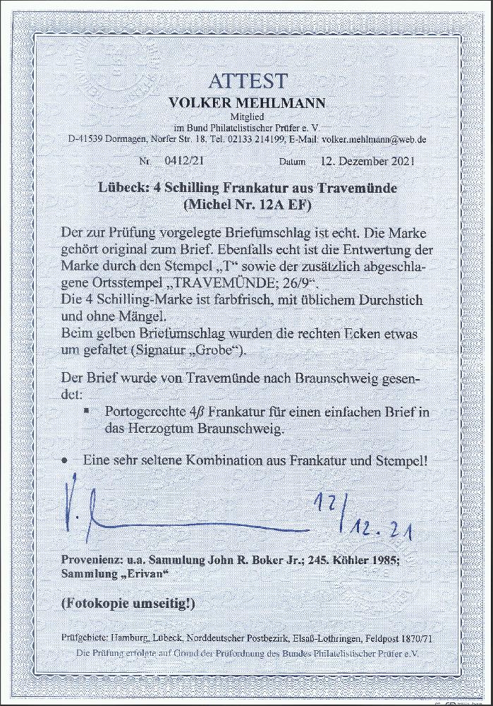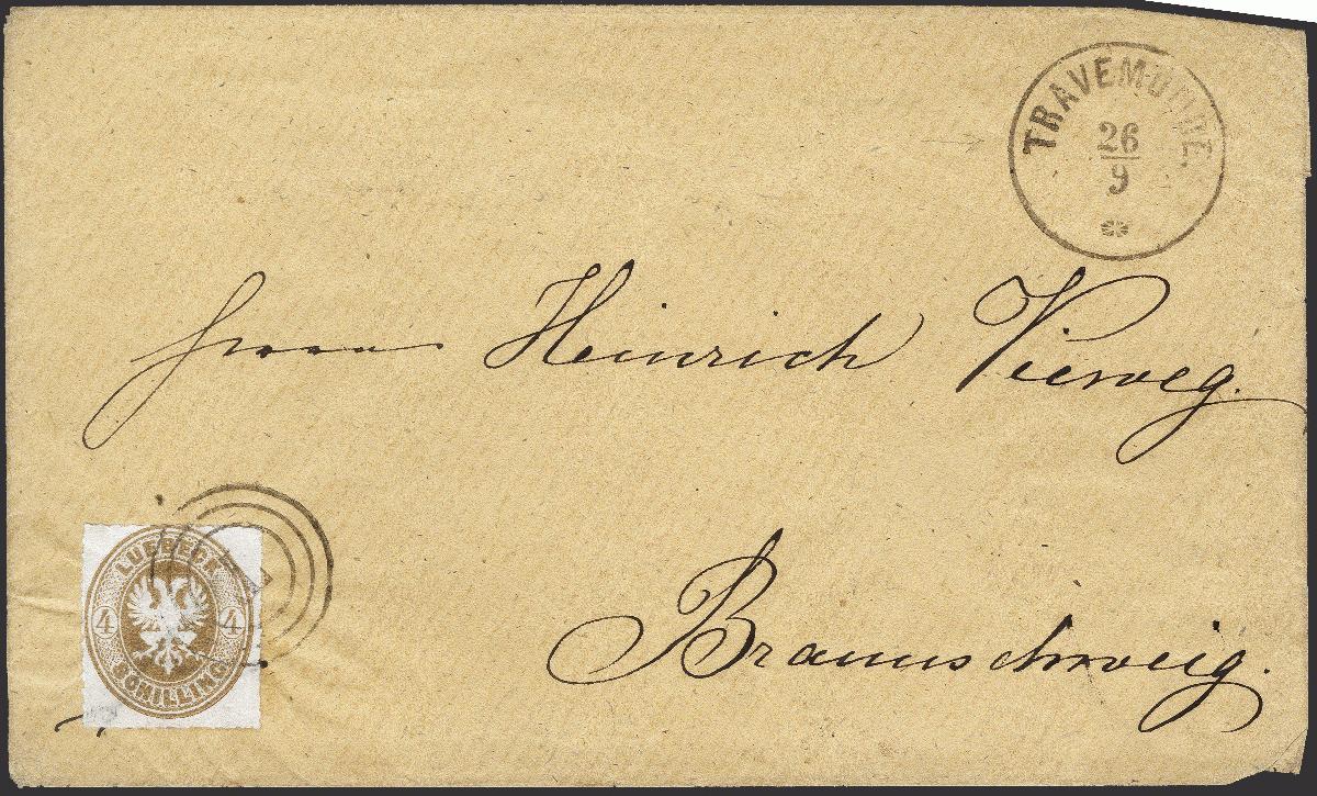 | Zusatzinformationen und Suchstichworte: | 378. Auktion Heinrich Köhler Auktionstermin 21.-26. März 2022 Los 99 1863/67, 4 Schilling mittelolivbraun, farbfrisch und mit einwandfreiem Durchstich, mit sauber aufgesetztem “T” im Kreis auf Briefkuvert mit sauber nebengesetztem Einkreisstempel “TRAVEMÜNDE 26/9” nach Braunschweig. Ein sehr attraktiver und seltener Brief. Ausruf 800,00 EUR Zuschlag 1.100,00 EUR (aus der Sammlung Erivan Haub) |