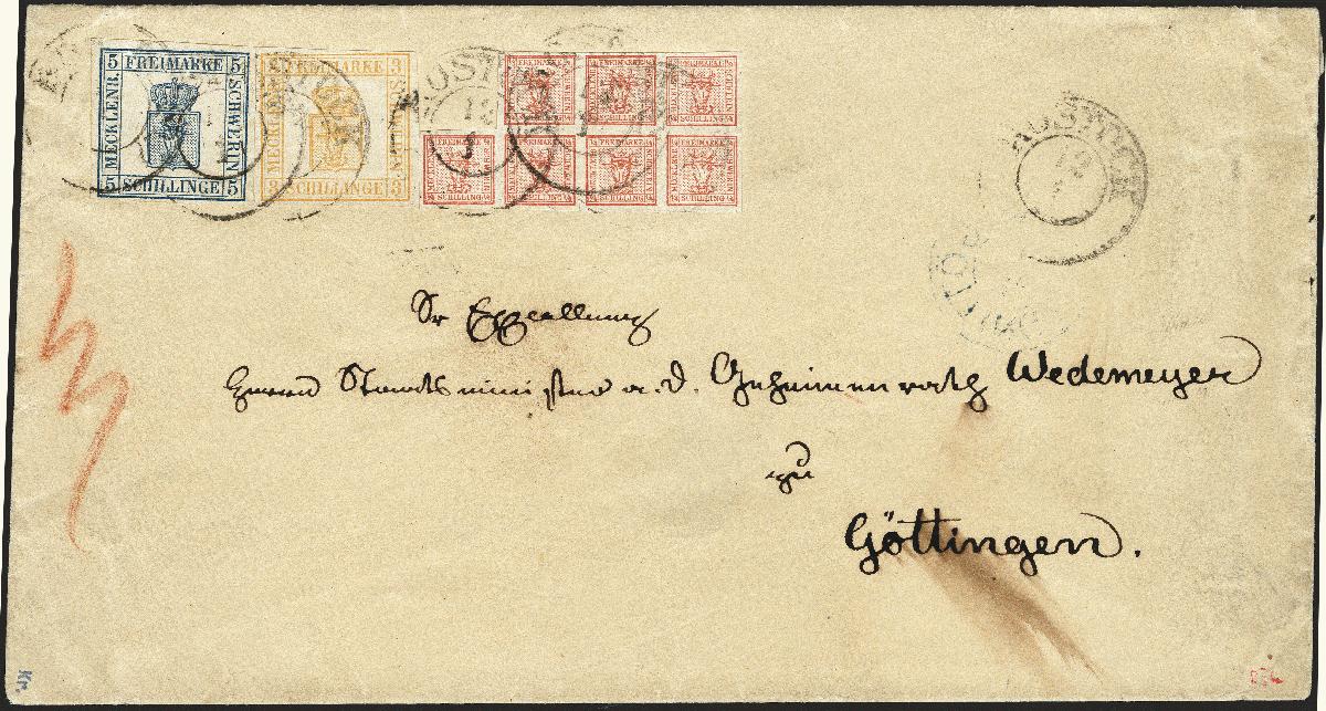 | Zusatzinformationen und Suchstichworte: | 378. Auktion Heinrich Köhler Auktionstermin 21.-26. März 2022 Los 103 7/4 Schilling lebhaftrot zusammen mit 3 Schilling dunkelchromgelb und 5 Schilling blau, alle farbfrisch und voll- bis breitrandig, als Streifen geklebt, mit mehrfach auf- und nebengesetztem kleinem Doppelkreisstempel „ROSTOCK 12 1“ auf etwas größerem Briefkuvert an den hannoverschen Ex-Staatsminister und Geheimen Rat Adolph Wedemeyer in Göttingen. Sehr schöne und einwandfreie Erhaltung; die Heinrich Köhler-Kartei hat nur 3 Briefe mit der kompletten 1. Ausgabe registriert, von denen dies der einzige mit einer vollständigen Nummer 1 ist. Ein faszinierender Brief mit einer attraktiven Frankatur in den Mecklenburgischen Landesfarben. Signiert Kruschel und Fotoattest Jäschke-Lantelme BPP (2021) Ausruf 10.000,00 EUR Zuschlag 42.000,00 EUR (aus der Sammlung Erivan Haub) |