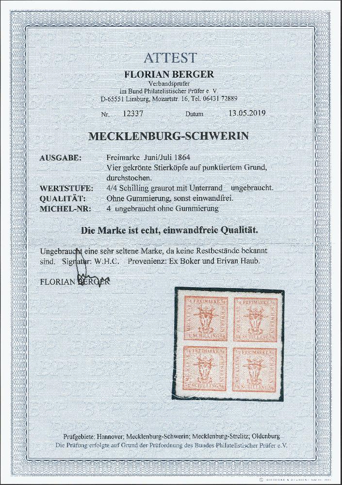 | Zusatzinformationen und Suchstichworte: | 378. Auktion Heinrich Köhler Auktionstermin 21.-26. März 2022 Los 104 4/4 Schilling graurot, farbfrisch und gut durchstochen, ungebraucht ohne Gummi. Eine seltene Marke in einwandfreier Erhaltung. Signiert Colson und Fotoattest Berger BPP (2019) Ausruf 800,00 EUR Zuschlag 1.700,00 EUR (aus der Sammlung Erivan Haub) |