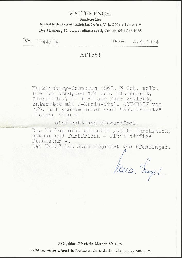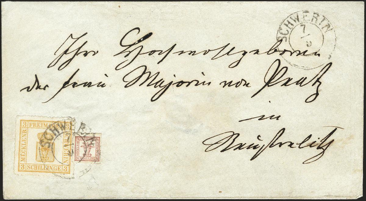 | Zusatzinformationen und Suchstichworte: | 378. Auktion Heinrich Köhler Auktionstermin 21.-26. März 2022 Los 106 3 Schilling gelblichorange mit breitem Rand, farbfrisch und allseits gut durchstochen, zusammen mit ¼ Schilling lebhaftbräunlichrot, mit sauber auf- und nebengesetztem Doppelkreisstempel "SCHWERIN 7/9" auf Briefkuvert nach Neustrelitz. Das Kuvert außerhalb der Frankatur leicht gereinigt, sonst einwandfrei. Eine seltene Kombination. Signiert Pfenninger und Fotoatteste Engel BPP (1974) und Jäschke-Lantelme BPP (2021). Ausruf 500,00 EUR Zuschlag 3.000 EUR (aus der Sammlung Erivan Haub) |