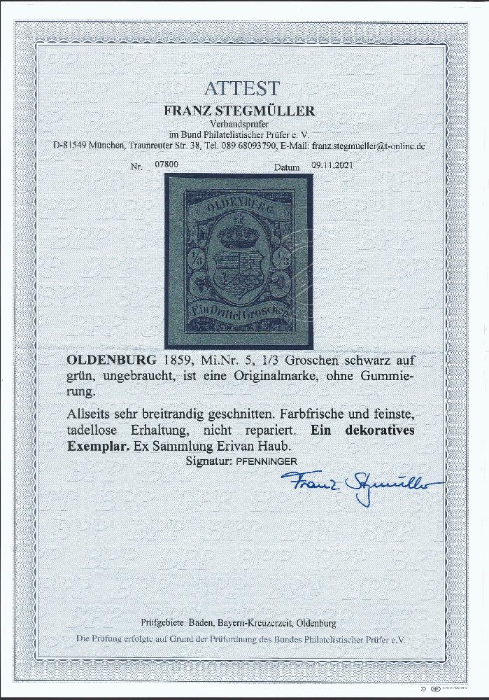 | Zusatzinformationen und Suchstichworte: | 378. Auktion Heinrich Köhler Auktionstermin 21.-26. März 2022 Los 116 ⅓ Silbergroschen schwarz auf grün, sehr schöne tiefe frische Farbe und allseits besonders breitrandig, ungebraucht ohne Gummi, tadellos. Ein sehr schönes Stück. Signiert Pfenninger und Fotoattest Stegmüller BPP (2021) Ausruf 500,00 EUR Zuschlag 1.600,00 EUR (aus der Sammlung Erivan Haub) |