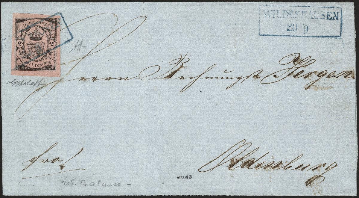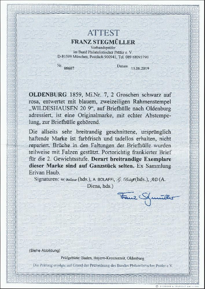 | Zusatzinformationen und Suchstichworte: | 378. Auktion Heinrich Köhler Auktionstermin 21.-26. März 2022 Los 120 2 Groschen schwarz auf mattrötlichkarmin in sehr schöner tiefer und frischer Farbe, allseits sehr breitrandig mit leicht auf- und nebengesetztem blauem Rahmenstempel „WILDESHAUSEN 20/9“ auf Briefhülle nach Oldenburg. Ein sehr schönes Stück in tadelloser Erhaltung. Mehrfach signiert, Fotoattest Stegmüller BPP (2019) Ausruf 1.000,00 EUR Zuschlag 1.000,00 EUR (aus der Sammlung Erivan Haub) |