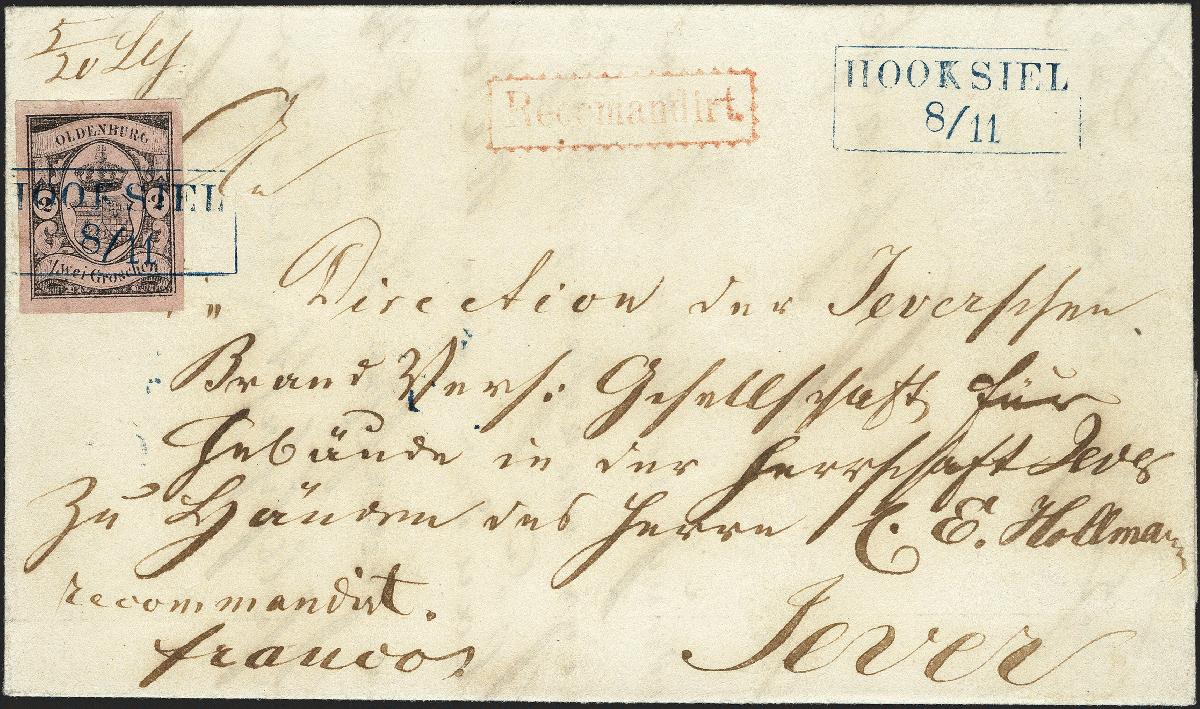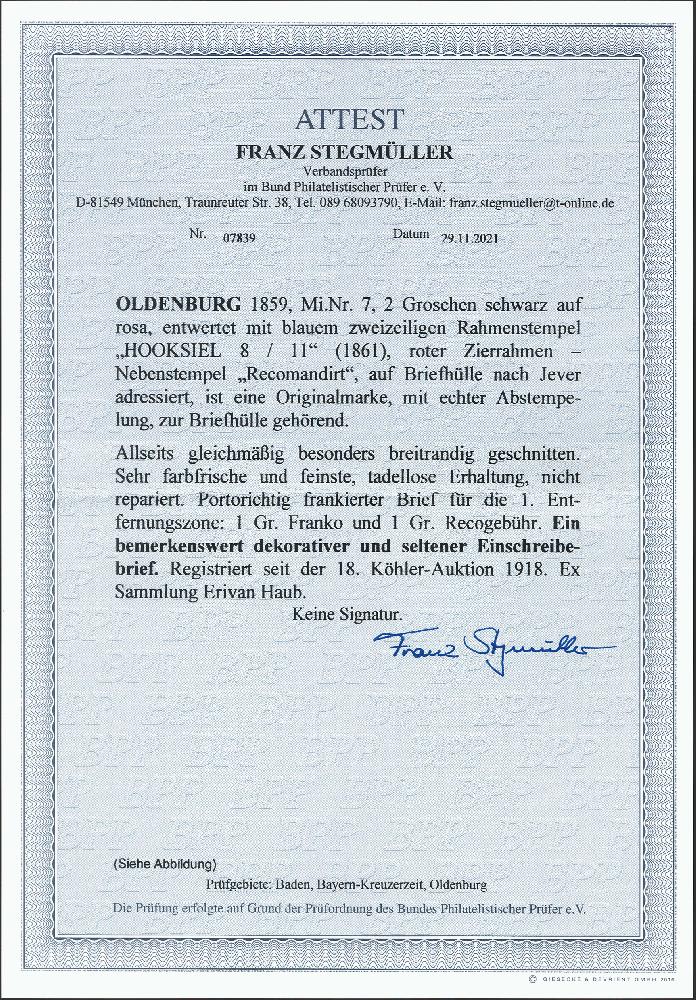 | Zusatzinformationen und Suchstichworte: | 378. Auktion Heinrich Köhler Auktionstermin 21.-26. März 2022 Los 121 2 Groschen schwarz auf rosa, allseits breitrandig und farbfrisch, mit klar auf- und nebengesetztem blauem Rahmenstempel "HOOKSIEL 8/11" (1861) auf eingeschriebenem Brief mit rotem Zackenkranzstempel "Recomandirt" nach Jever mit Ankunftsstempel. Ein attraktiver und seltener Chargé-Brief in tadelloser Erhaltung. Fotoattest Stegmüller BPP (2021) Ausruf 1.000,00 EUR Zuschlag 4.000,00 EUR (aus der Sammlung Erivan Haub) |