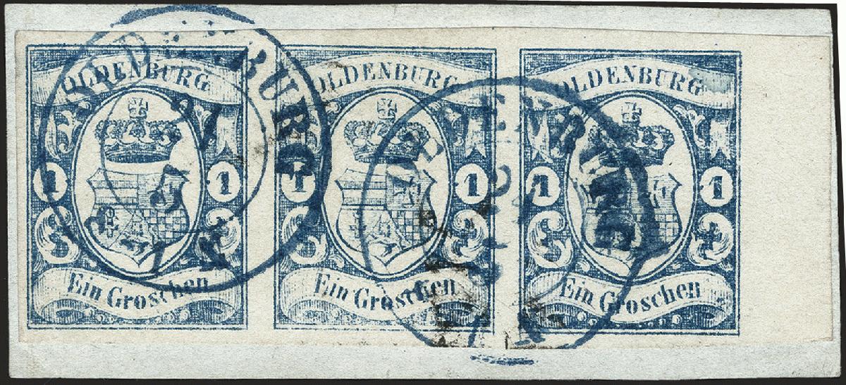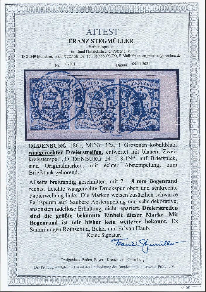 | Zusatzinformationen und Suchstichworte: | 378. Auktion Heinrich Köhler Auktionstermin 21.-26. März 2022 Los 123 1861, 1 Groschen kobaltblau im waagerechten Dreierstreifen, farbfrisch und allseits breitrandig geschnitten, rechts mit 7/8 mm Bogenrand, mit sauber aufgesetztem blauem Doppelkreisstempel „OLDENBURG 24/5“ auf kleinem Briefstück. Leichte waagerechte Druckspur und links senkrechte Papierwellung, sonst tadellos und äußerst attraktiv. Größte gebrauchte Einheit dieser Marke; wir haben nur einen weiteren Dreierstreifen registriert. Fotoattest Stegmüller BPP (2021) Ausruf 3.000,00 EUR Zuschlag 9.500,00 EUR (aus der Sammlung Erivan Haub) |