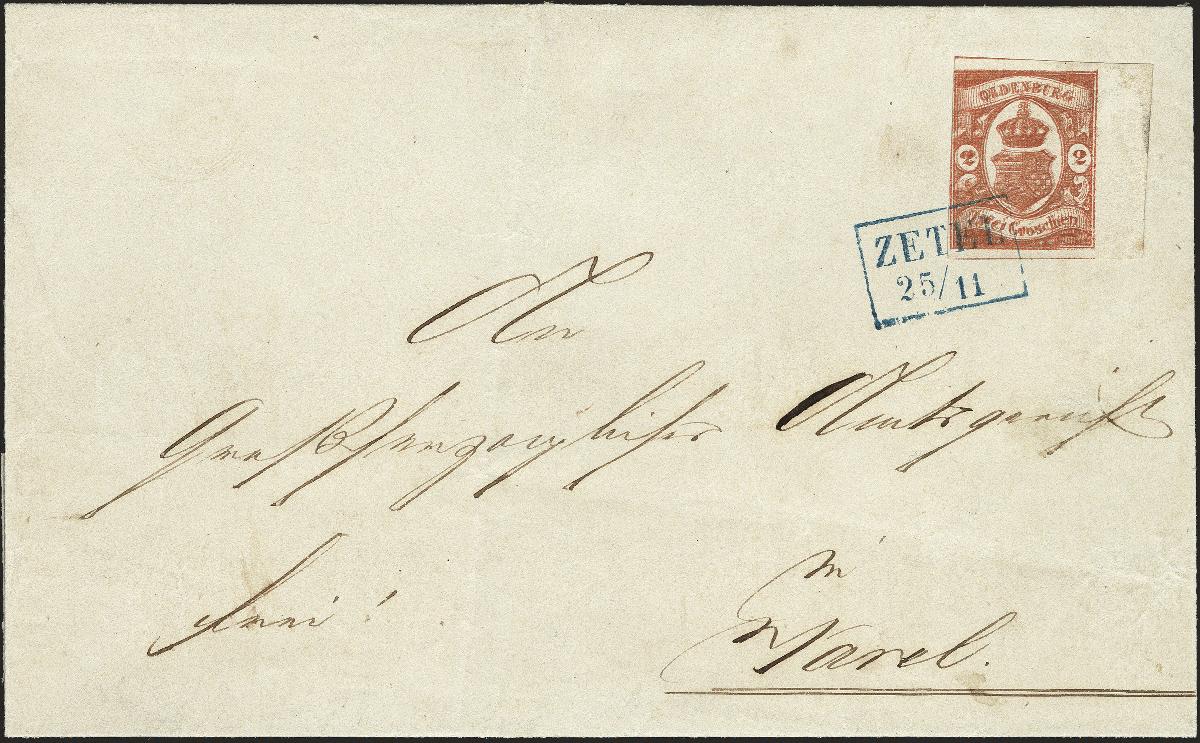 | Zusatzinformationen und Suchstichworte: | 378. Auktion Heinrich Köhler Auktionstermin 21.-26. März 2022 Los 125 1861, 2 Groschen mit deutlichem, seitlich verschoben Doppeldruck in zwei unterschiedlichen Nuancen, links etwas angeschnitten, sonst sehr breit-bis überrandig, oben mit Teil der Nachbarmarke und rechts mit ca. 6 mm Bogenrand, mit glasklar aufgesetztem Rahmenstempel „ZETEL 25/11“ auf Briefhülle der 2. Gewichtsstufe nach Varel mit Ankunftsstempel vom selben Tag. Die Entstehung dieser außerordentlich seltenen Abart ist heute nicht mehr eindeutig zu klären; vermutlich handelt es sich um einen sogenannten ‚Einrichtebogen‘ des Druckvorganges, bei dem der erste, ‚verunglückte‘ Druck in braunroter Farbe mit der gewünschten zinnoberroten Farbe überdruckt wurde und - wahrscheinlich versehentlich - nach Zetel ausgeliefert wurde. Neben diesem einmaligen Brief ist nur noch ein loses Stück, ebenfalls mit Stempel von Zetel, bekannt. Eine große Seltenheit der Oldenburg-Philatelie. Fotoattest Stegmüller BPP (2021) Ausruf 8.000,00 EUR Zuschlag 29.000,00 EUR (aus der Sammlung Erivan Haub) |