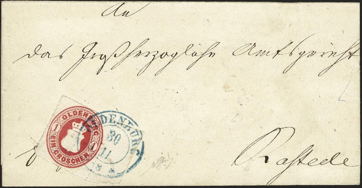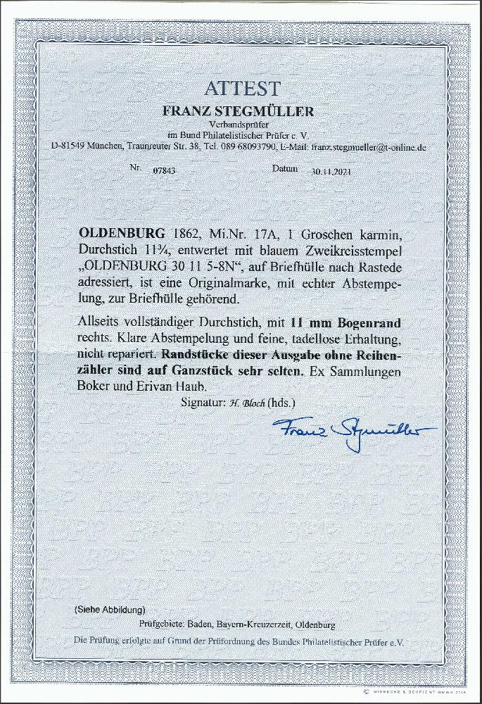 | Zusatzinformationen und Suchstichworte: | 378. Auktion Heinrich Köhler Auktionstermin 21.-26. März 2022 Los 126 1862, 1 Groschen karmin, rechtes Randstück mit ca. 11 mm Bogenrand ohne Reihenzähler, farbfrisch und einwandfrei durchstochen, mit blauem Doppelkreisstempel „OLDENBURG 30/11“ auf kleiner Briefhülle nach Rastede. Tadellose und frische Erhaltung (etwas umgefaltet). Signiert Bloch und Fotoattest Stegmüller BPP (2021) Ausruf 400,00 EUR Zuschlag 520,00 EUR (aus der Sammlung Erivan Haub) |