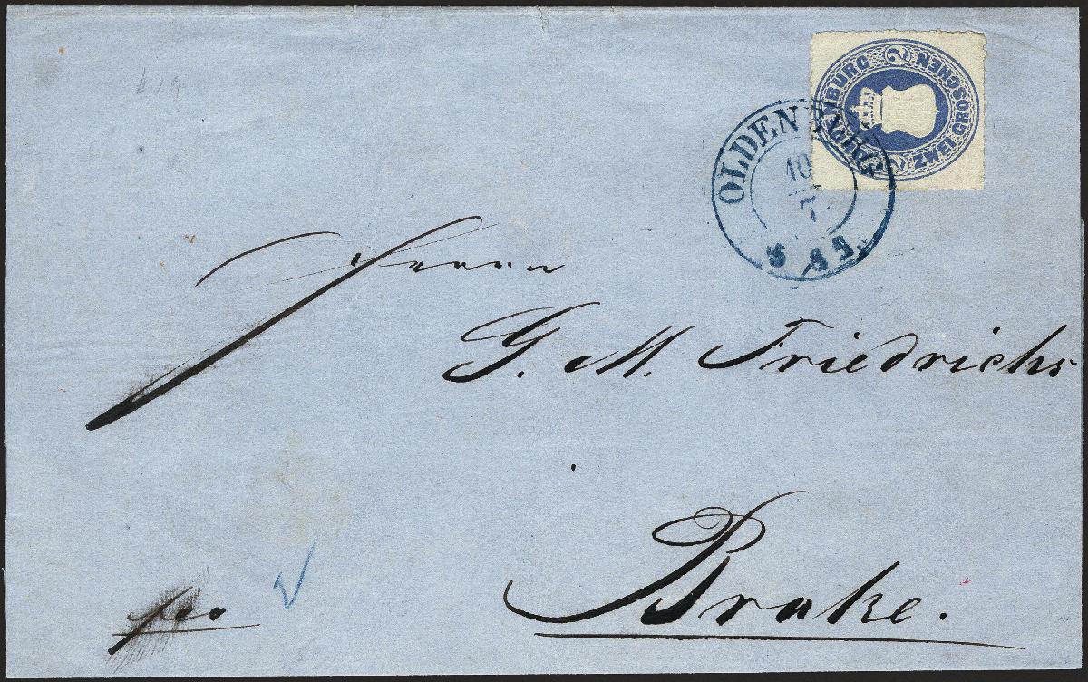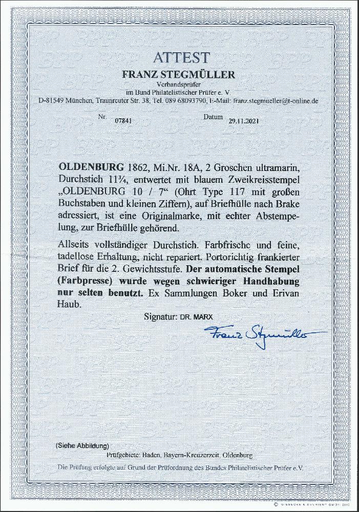 | Zusatzinformationen und Suchstichworte: | 378. Auktion Heinrich Köhler Auktionstermin 21.-26. März 2022 Los 127 2 Groschen ultramarin, farbfrisch und einwandfrei durchstochen, sauber entwertet durch sogenannten 'Maschinenstempel' "OLDENBURG 10/7" auf Briefhülle der 2. Gewichtsstufe nach Brake. Dieser Stempel wurde wegen seiner schwierigen Handhabung (Farbpresse) nur gelegentlich benutzt und ist auf Brief selten. Fotoattest Stegmüller BPP (2021) Ausruf 300,00 EUR Zuschlag 600,00 EUR (aus der Sammlung Erivan Haub) |