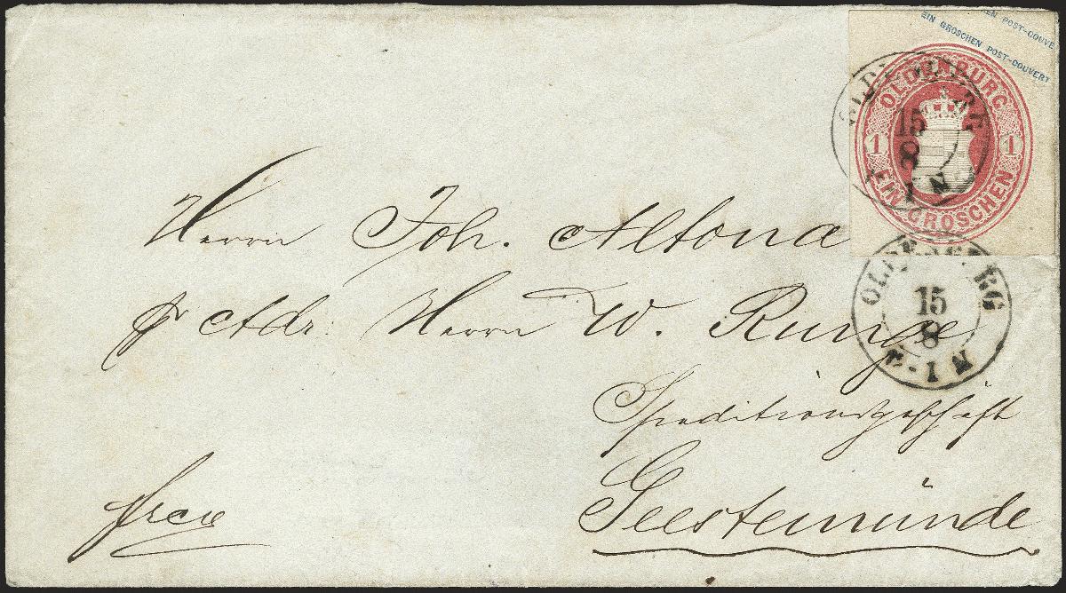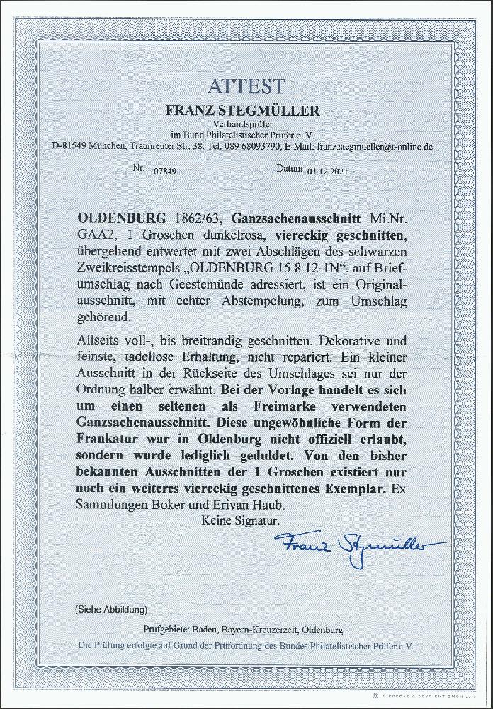 | Zusatzinformationen und Suchstichworte: | 378. Auktion Heinrich Köhler Auktionstermin 21.-26. März 2022 Los 128 1862/63, Ganzsachenausschnitt 1 Groschen dunkelrosa mit Überdruck oben rechts, farbfrisch und allseits voll-bis breitrandig viereckig geschnitten, mit zweimal sauber übergehend aufgesetztem Doppelkreisstempel „OLDENBURG 15/8“ in schwarzer Farbe (= 1867) auf Briefkuvert nach Geestemünde mit Ankunftsstempel. Kleiner Teil der Rückseite ausgeschnitten, sonst tadellos. Ein außerordentlich seltener und attraktiver Brief; die Verwendung von Ganzsachenausschnitten war in Oldenburg nicht offiziell erlaubt, wurde jedoch geduldet. Von den wenigen bisher bekannten Ausschnitten der 1 Groschen existiert nur noch ein weiteres viereckig geschnittenes Exemplar. Fotoattest Stegmüller BPP (2021) Ausruf 4.000,00 EUR Zuschlag 30.000,00 EUR (aus der Sammlung Erivan Haub) |
