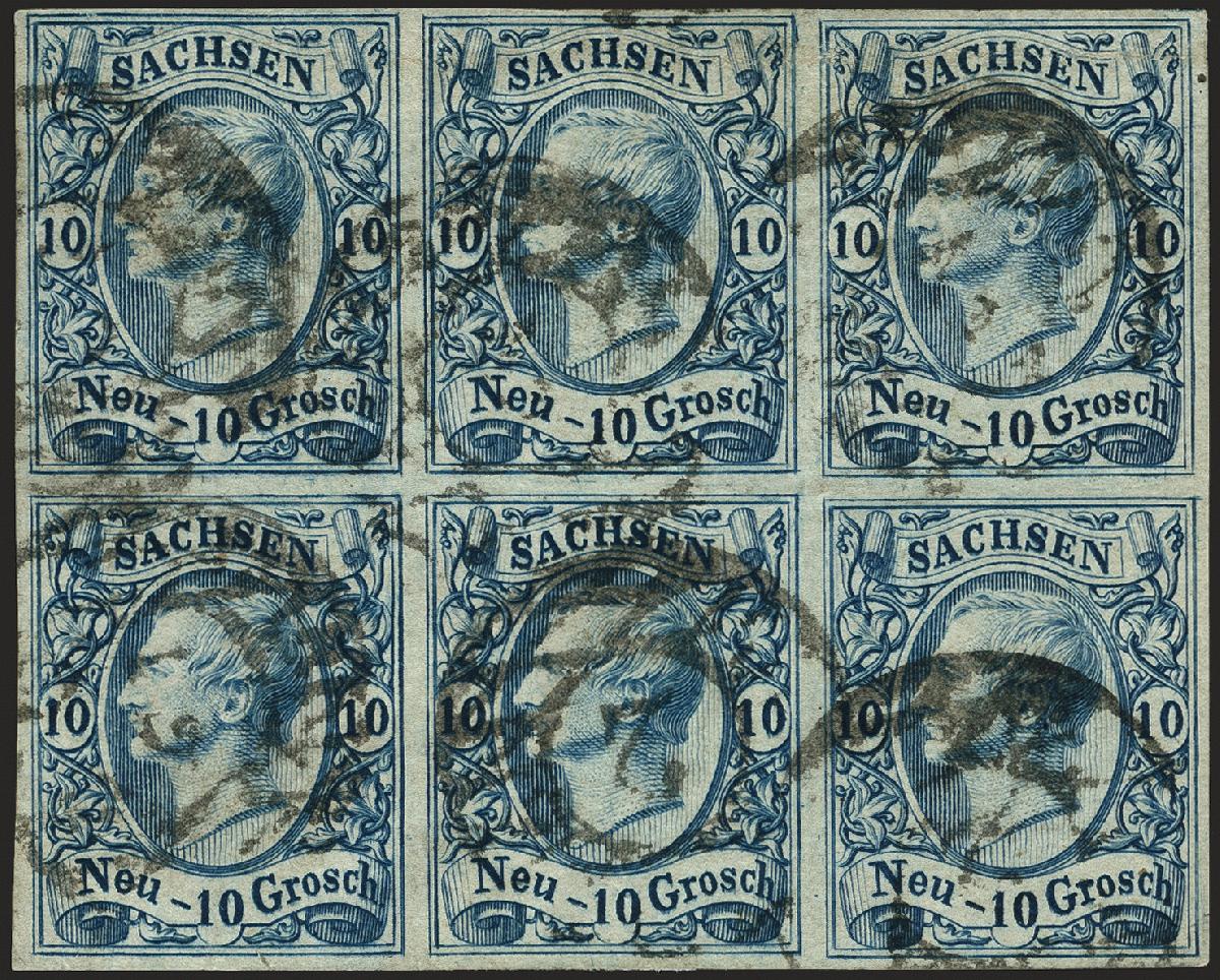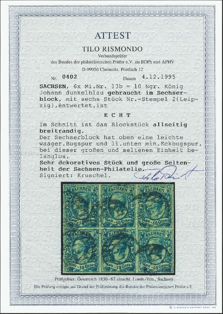 | Zusatzinformationen und Suchstichworte: | 378. Auktion Heinrich Köhler Auktionstermin 21.-26. März 2022 Los 235 Johann 10 Neugroschen dunkelblau im waagerechten Sechserblock, farbfrisch und allseits gut voll- bis meist breitrandig, entwertet durch mehrfach leicht aufgesetzte Nummer „2“ LEIPZIG. Die oberen Marken geringe und fast unmerkliche waagerechte Bugspur auf der Höhe des oberen Schriftbandes und links unten minimaler Eckknitter, sonst völlig einwandfrei. Der Sechserblock ist die größte gebrauchte Einheit dieser Marke, es ist nur ein weiterer registriert. Eine große Seltenheit der Sachsen-Philatelie. Signiert Kruschel und Fotoattest Rismondo BPP (1995) Ausruf 8.000,00 EUR Zuschlag 11.000,00 EUR (aus der Sammlung Erivan Haub) |