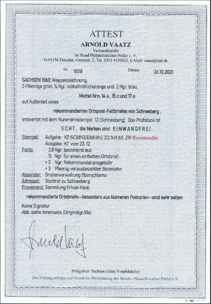 | Zusatzinformationen und Suchstichworte: | 378. Auktion Heinrich Köhler Auktionstermin 21.-26. März 2022 Los 238 3 Pfennige grün, ½ Neugroschen trüborange und 2 Neugroschen blau, alle farbfrisch und einwandfrei gezähnt, mit jeweils sauber aufgesetzter Nummer „13“ und klar nebengesetztem Doppelkreisstempel „SCHNEEBERG 22 XII 65“ auf rekommandierter Ortsbrief-Hülle der Grubenverwaltung Oberschlema an den Stadtrat von Schneeberg. Besonders schöne und tadellose Erhaltung. Ein äußerst attraktiver und sehr seltener eingeschriebener Ortsbrief, zudem von einem kleinen Postort. Fotoattest Vaatz BPP (2021) Ausruf 1.500,00 EUR Zuschlag 4.600,00 EUR (aus der Sammlung Erivan Haub) |