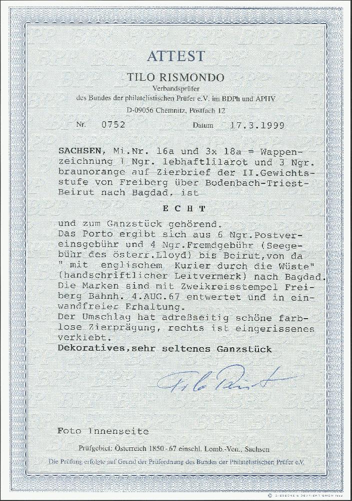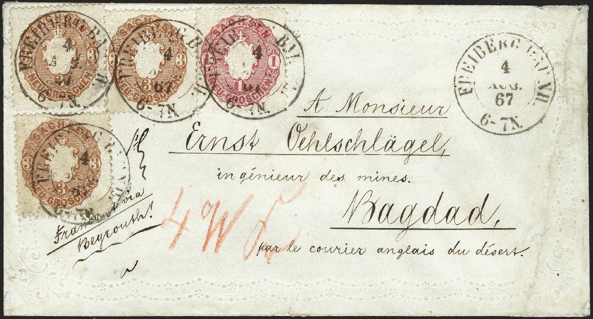 | Zusatzinformationen und Suchstichworte: | 378. Auktion Heinrich Köhler Auktionstermin 21.-26. März 2022 Los 240 1 Neugroschen lebhaftlilarot und drei Einzelwerte 3 Neugroschen braunorange, mit Doppelkreisstempel „FREIBERG BAHNH. 4 AUG. 67“ auf Briefkuvert mit farblos geprägter Zierborte, mit Leitvermerken „..via Beyrouth“ und „ par le courier anglais du désert“ an die bekannte Adresse ‚Ernst Oehlschlägel‘ nach Bagdad,. Der Brief fiel in die zwei. Gewichtsstufe und ist entsprechend korrekt frankiert mit 6 Neugroschen Postvereinsgebühr und 4 Neugroschen österreichischem Seepostporto. Leichte Reinigungsspuren; das Kuvert rechts repariert. Ein attraktiver Brief mit seltener Destination. Fotoattest Rismondo BPP (1999) Ausruf 5.000,00 EUR Zuschlag 5.000,00 EUR (aus der Sammlung Erivan Haub) |