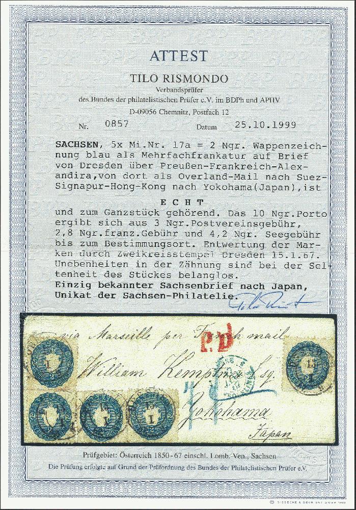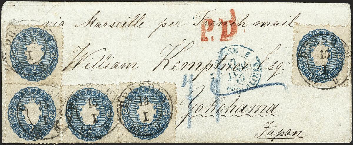 | Zusatzinformationen und Suchstichworte: | 378. Auktion Heinrich Köhler Auktionstermin 21.-26. März 2022 Los 241 2 Neugroschen blau, fünf Einzelwerte, mit kleinem Doppelkreisstempel „DRESDEN 15 I. 67“ auf Briefkuvert über Frankreich nach Yokohama, Japan, mit vorderseitigem blauem Transitstempel „PRUSSE ERQUELINES“; rückseitig Teil eines weiteren Transitstempels; kleiner Teil der Rückklappe fehlend. Das Porto setzt sich zusammen aus 3 Neugroschen Postvereinsgebühr, 2,8 Neugroschen französischem Transit und 4,2 Neugroschen Seegebühr bis zum Bestimmungsort. Die Frankatur durch Randklebung in der Zähnung teilweise leicht gestoßen, ein Wert unauffällige senkrechte Bugspur; insgesamt für diese Destination gute und frische Erhaltung. Japan stellt für alle altdeutschen Staaten eine der seltensten und exotischsten Destinationen dar. Dies ist der einzige registrierte Brief Sachsens nach Japan und einer der wertvollsten Auslandsbriefe der altdeutschen Staaten. Fotoattest Rismondo BPP Ausruf 18.000,00 EUR Zuschlag 22.000,00 EUR (aus der Sammlung Erivan Haub) |