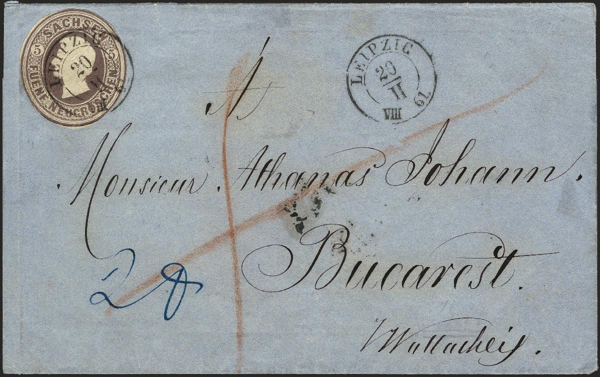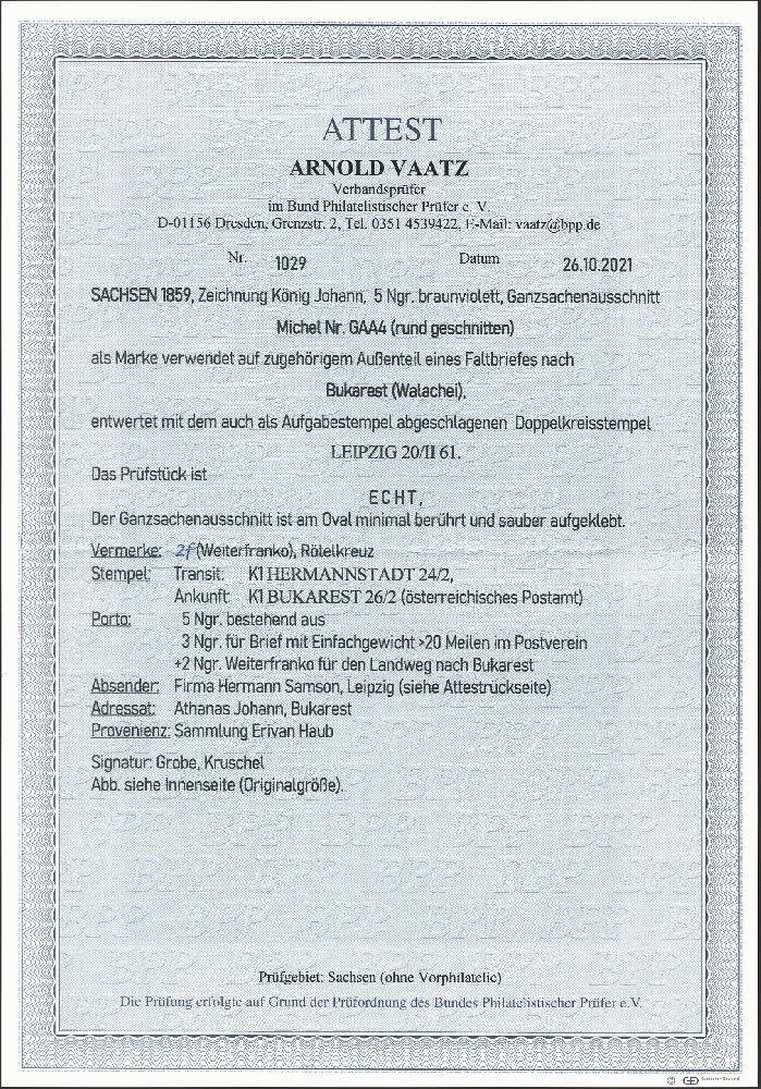 | Zusatzinformationen und Suchstichworte: | 378. Auktion Heinrich Köhler Auktionstermin 21.-26. März 2022 Los 243 1859, Ganzsachenausschnitt 5 Neugroschen braunviolett, rund geschnitten, mit sauber auf- und nebengesetztem kleinen Doppelkreisstempel „LEIPZIG 20/II 61“ auf Briefhülle nach Bukarest in der Walachei, mit Durchgangsstempel von Hermannstadt und Ankunftsstempel des österreichischen Postamtes. Der Brief ist portogerecht frankiert mit 3 Neugroschen Postvereinsgebühr und 2 Neugroschen Weiterfranko. Ein attraktiver und seltener Brief in sehr schöner Erhaltung. Signiert Grobe und Kruschel, Fotoattest Vaatz BPP (2021) Ausruf 1.000,00 EUR Zuschlag 3.800,00 EUR (aus der Sammlung Erivan Haub) |