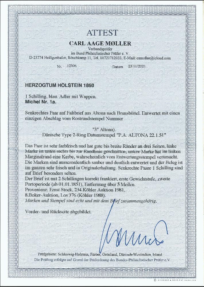 | Zusatzinformationen und Suchstichworte: | 378. Auktion Heinrich Köhler Auktionstermin 21.-26. März 2022 Los 244 1850, 1 Schilling blau im senkrechten Paar, unten rechts kurz in der Randlinie berührt, sonst voll- bis meist breitrandig, mit klar und leicht aufgesetztem Roststempel "3“ auf komplettem Faltbrief mit sauber nebengesetztem Doppelkreisstempel "P. A. ALTONA 22/1 51“ nach Brunsbüttel. Die untere Marke links kleiner Randspalt, wahrscheinlich bedingt durch die Abstempelung, sonst einwandfrei. Der Brief ist mit 2 Schilling korrekt frankiert für die erste Gewichtsstufe und einer Entfernung über 5 Meilen in der 2. Portoperiode ab dem 1. Januar 1851. Eine seltene und attraktive Frankatur; wir haben nur ein weiteres senkrechtes Paar auf Brief registriert. Fotoatteste RPSL (1929, etwas lädiert), und Møller BPP (2021) Ausruf 10.000,00 EUR Zuschlag 13.000,00 EUR (aus der Sammlung Erivan Haub) |