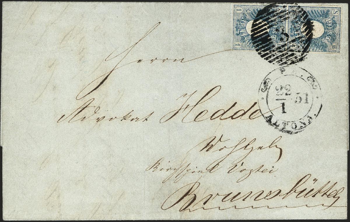 | Zusatzinformationen und Suchstichworte: | 378. Auktion Heinrich Köhler Auktionstermin 21.-26. März 2022 Los 244 1850, 1 Schilling blau im senkrechten Paar, unten rechts kurz in der Randlinie berührt, sonst voll- bis meist breitrandig, mit klar und leicht aufgesetztem Roststempel "3“ auf komplettem Faltbrief mit sauber nebengesetztem Doppelkreisstempel "P. A. ALTONA 22/1 51“ nach Brunsbüttel. Die untere Marke links kleiner Randspalt, wahrscheinlich bedingt durch die Abstempelung, sonst einwandfrei. Der Brief ist mit 2 Schilling korrekt frankiert für die erste Gewichtsstufe und einer Entfernung über 5 Meilen in der 2. Portoperiode ab dem 1. Januar 1851. Eine seltene und attraktive Frankatur; wir haben nur ein weiteres senkrechtes Paar auf Brief registriert. Fotoatteste RPSL (1929, etwas lädiert), und Møller BPP (2021) Ausruf 10.000,00 EUR Zuschlag 13.000,00 EUR (aus der Sammlung Erivan Haub) |