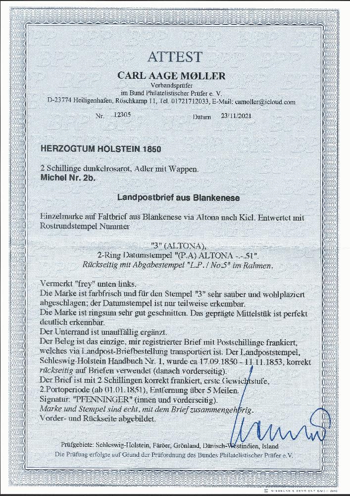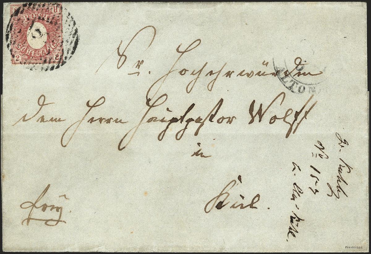 | Zusatzinformationen und Suchstichworte: | 378. Auktion Heinrich Köhler Auktionstermin 21.-26. März 2022 Los 245 2 Schilling dunkelrosa, unten rechts unmerkliche kleine Randreparatur, sonst voll-bis breitrandig und farbfrisch, mit leicht aufgesetztem Roststempel "3" auf Briefhülle mit rückseitigem Aufgabe Stempel "L. P./No.5“ von Blankenese und vorderseitig etwas schwach abgeschlagenem Doppelkreisstempel von Altona, an den Hauptpastor Wolff in Kiel. Der Brief ist korrekt frankiert in der 2. Portoperiode für eine Distanz über 5 Meilen in der 1. Gewichtsstufe. Vorderseitig kleiner privater Eingangsvermerk. Dies ist der einzige bisher registrierte Landpost-Brief der Wappenausgabe und somit eines der bedeutendsten Stücke der Postgeschichte Schleswig-Holsteins; darüber hinaus stellt schon die 2 Schilling in der b-Farbe auf Brief eine große Seltenheit dar. Fotoatteste Pfenninger (1970, 'tadellos') und Møller BPP (2021) Ausruf 8.000,00 EUR Zuschlag 15.000,00 EUR (aus der Sammlung Erivan Haub) |