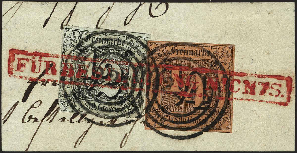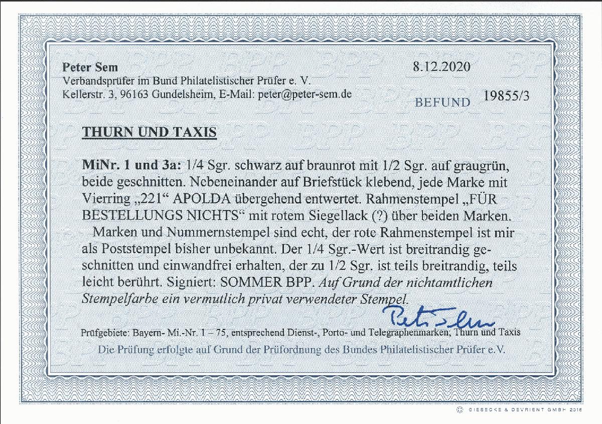 | Zusatzinformationen und Suchstichworte: | 378. Auktion Heinrich Köhler Auktionstermin 21.-26. März 2022 Los 259 1852/58, ¼ Silbergroschen schwarz auf braunorange, voll- bis überrandig, zusammen mit leicht berührter ½ Silbergroschen schwarz auf graugrün, mit klarer Nummer "221" APOLDA sowie übergehend aufgesetztem roten Rahmenstempel “FÜR BESTELLUNG NICHTS" (unbekannter Herkunft) auf Briefstück. Einwandfrei und sehr attraktiv. Fotoattest Sommer BPP (1985) und Fotobefund Sem BPP (2020 Ausruf 100,00 EUR Zuschlag 650,00 EUR (aus der Sammlung Erivan Haub) |