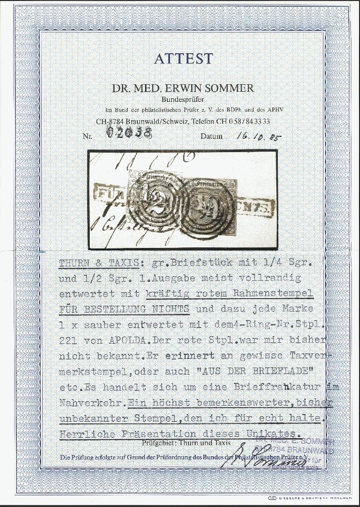 | Zusatzinformationen und Suchstichworte: | 378. Auktion Heinrich Köhler Auktionstermin 21.-26. März 2022 Los 259 1852/58, ¼ Silbergroschen schwarz auf braunorange, voll- bis überrandig, zusammen mit leicht berührter ½ Silbergroschen schwarz auf graugrün, mit klarer Nummer "221" APOLDA sowie übergehend aufgesetztem roten Rahmenstempel “FÜR BESTELLUNG NICHTS" (unbekannter Herkunft) auf Briefstück. Einwandfrei und sehr attraktiv. Fotoattest Sommer BPP (1985) und Fotobefund Sem BPP (2020 Ausruf 100,00 EUR Zuschlag 650,00 EUR (aus der Sammlung Erivan Haub) |