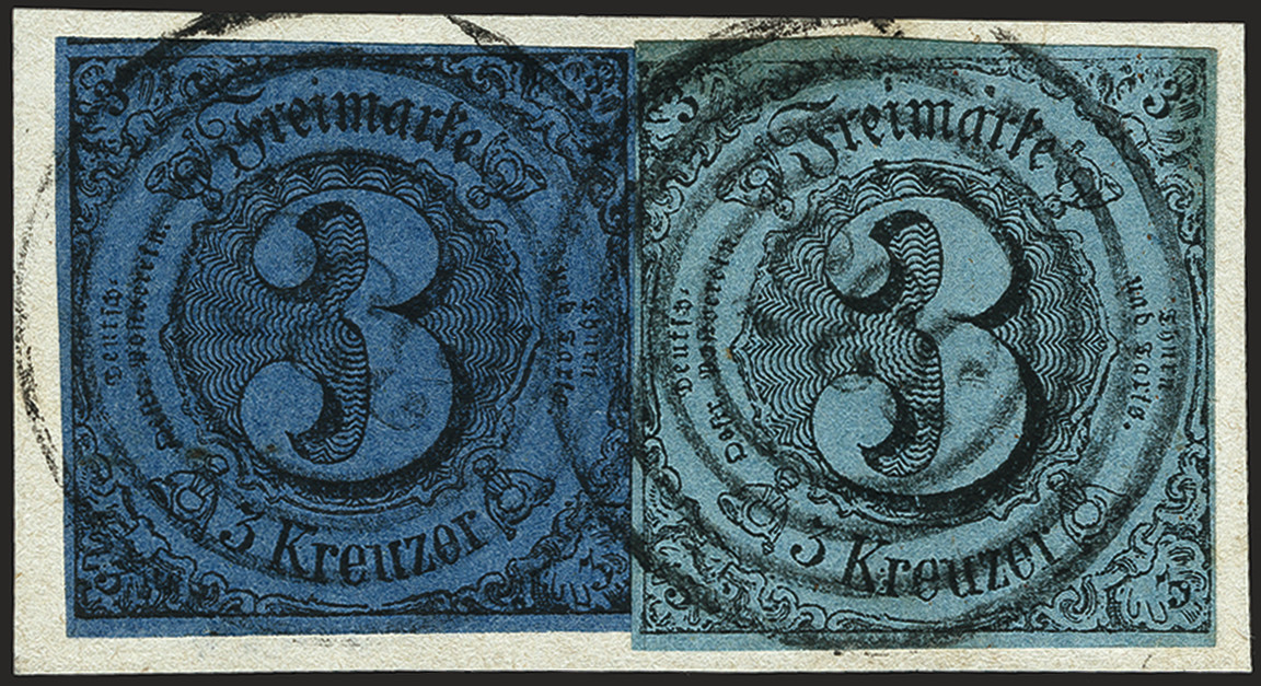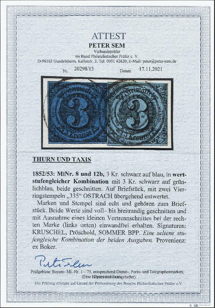 | Zusatzinformationen und Suchstichworte: | 378. Auktion Heinrich Köhler Auktionstermin 21.-26. März 2022 Los 263 3 Kreuzer schwarz auf dunkelblau in wertstufengleicher Mischfrankatur mit 1853, 3 Kreuzer schwarz auf grünlichblau, beide voll- bis breitrandig und bis auf einen kleinen Vortrennschnitt unten bei der rechts klebenden Marke tadellos, mit jeweils sauber aufgesetzter Nummer “335“ OSTRACH auf kleinem Briefstück. Ein ganz ungewöhnliches Stück. Fotoattest Sem BPP (2021) Ausruf 200,00 EUR Zuschlag 480,00 EUR (aus der Sammlung Erivan Haub) |