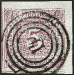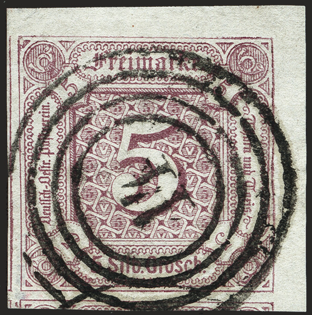 | Zusatzinformationen und Suchstichworte: | 378. Auktion Heinrich Köhler Auktionstermin 21.-26. März 2022 Los 268 5 Silbergroschen braunpurpur, rechte obere Bogenecke, allseits überrandig geschnitten, oben und rechts mit je ca. 2,5 mm Bogenrand, an den anderen Seiten mit Teilen aller drei Nachbarmarken, klar und zentrisch entwertet durch Nummer „14“ CASSEL, tadellos. Ein phänomenales Stück. Fotoattest Sem BPP (2021) Ausruf 500,00 EUR Zuschlag 1.400,00 EUR (aus der Sammlung Erivan Haub) |