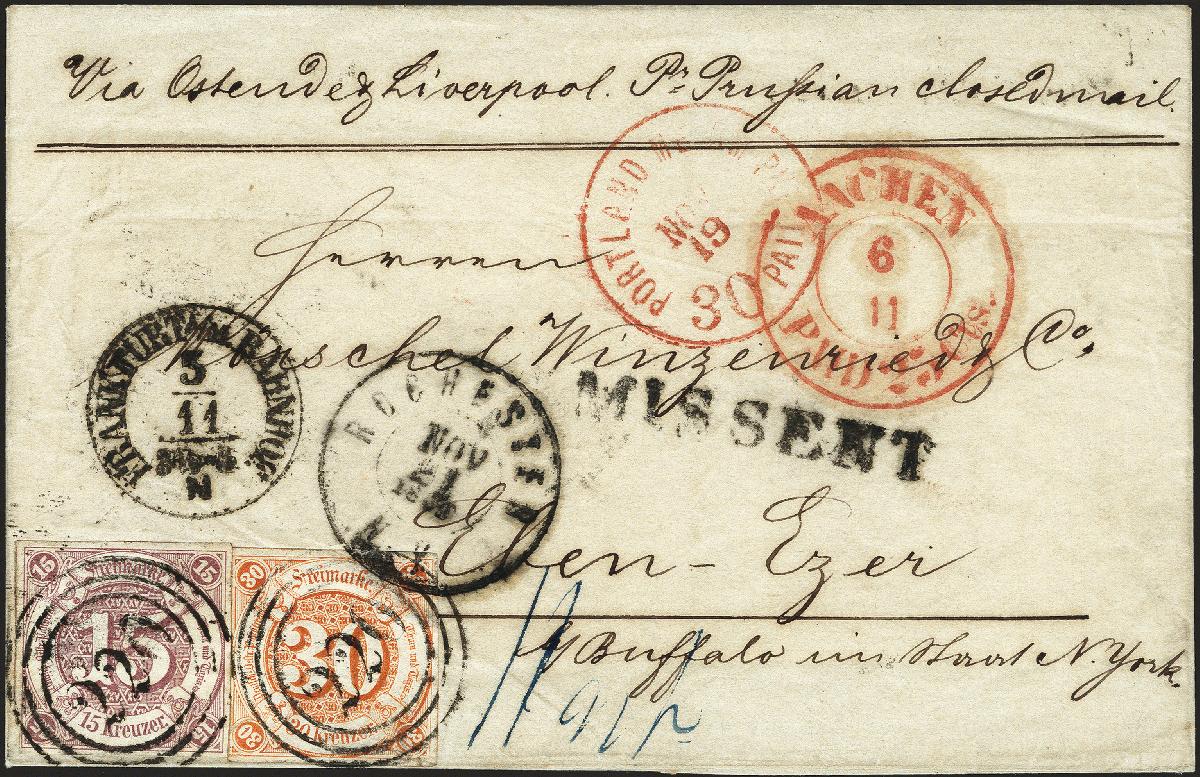 | Zusatzinformationen und Suchstichworte: | 378. Auktion Heinrich Köhler Auktionstermin 21.-26. März 2022 Los 269 15 Kreuzer braunpurpur, voll-bis breitrandig, zusammen mit teils leicht berührter 30 Kreuzer orange, mit jeweils sauber aufgesetzter Nummer „220“ auf Briefhülle mit nebengesetztem Einkreisstempel „FRANKFURT A/M. BAHNHOF 5/11“ nach Eben-Ezer im Staate New York, befördert über die ‚Prussian closed mail‘ mit vorderseitigem „PORTLAND ME AM PKT./30 PAID“. Die 30 Kreuzer unauffälliges Rißchen unten links und leichte Knitterspuren, sonst einwandfrei. Ein attraktiver und seltener Brief mit den beiden Höchstwerten. Fotoattest Sem BPP (2021). Ausruf 800,00 EUR Zuschlag 5.200,00 EUR (aus der Sammlung Erivan Haub) |