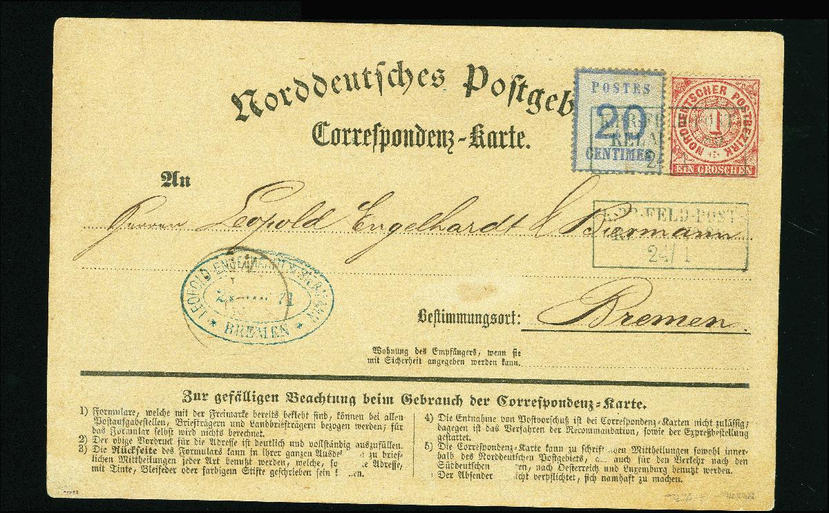 | Zusatzinformationen und Suchstichworte: | 378. Auktion Heinrich Köhler Auktionstermin 21.-26. März 2022 Los 286 Spitzen nach oben: 20 Centimes auf - wahrscheinlich aus Bremen mit NDP 1 Groschen vorfrankiert mitgenommener - 'Correspondenz-Karte' nach Bremen, die Frankatur sauber entwertet durch Rahmenstempel „K.PR. FELD-POST-RELAIS No. 80/ 24 1“, dieser zusätzlich nebengesetzt. Das Porto war einige Tage vorher auf 15 Centimes herabgesetzt worden. Eine ungewöhnliche und interessante Karte. Signiert Köhler und Fotoattest Mehlmann BPP (2020) Ausruf 500,00 EUR Zuschlag 4.000,00 EUR (aus der Sammlung Erivan Haub) |
