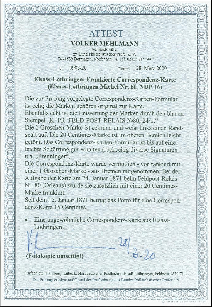 | Prüfgebiet: | Norddeutscher Postbezirk 1870 - 1871 Elsass-Lothringen |