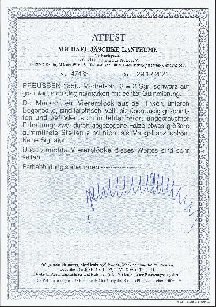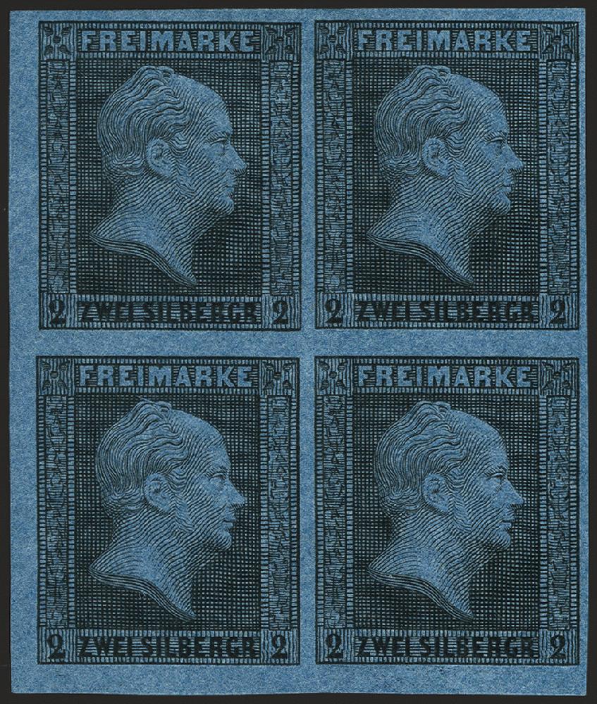 | Zusatzinformationen und Suchstichworte: | 378. Auktion Heinrich Köhler Auktionstermin 21.-26. März 2022 Los 130 2 Silbergroschen schwarz auf graublau im Viererblock aus der linken unteren Bogenecke, sehr schön farbfrisch und voll- bis breitrandig, ungebraucht mit Originalgummi und etwas größeren gummifreien Stellen durch Falzentfernung. Viererblocks sind die größten bekannten ungebrauchten Einheiten dieses Wertes. Eine seltene und attraktive Einheit in einwandfreier Erhaltung. Fotoattest Jäschke-Lantelme BPP (2021) Ausruf 500,00 EUR Zuschlag 1.300,00 EUR (aus der Sammlung Erivan Haub) |