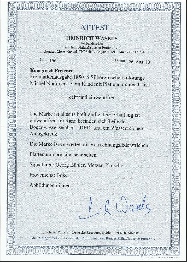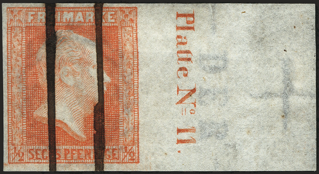 | Zusatzinformationen und Suchstichworte: | 378. Auktion Heinrich Köhler Auktionstermin 21.-26. März 2022 Los 134 ½ Silbergroschen rotorange, voll- bis breitbandiges rechtes Randstück mit ca. 25 mm Bogenrand mit Randinschrift „Platte No.11“ und Teil des Bogenwasserzeichens „DER“ sowie Wasserzeichen-Anlagekreuz, entwertet durch Verrechnungs-Federzüge. Ein sehr seltenes Stück in einwandfreier Erhaltung. Signiert Georg Bühler, Metzer und Kruschel, Fotoattest Wasels BPP (2019) Ausruf 800,00 EUR Zuschlag 4.000,00 EUR (aus der Sammlung Erivan Haub) |