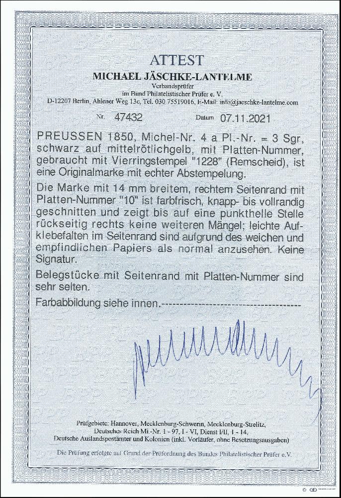 | Zusatzinformationen und Suchstichworte: | 378. Auktion Heinrich Köhler Auktionstermin 21.-26. März 2022 Los 141 3 Silbergroschen schwarz auf gelb, voll bis breitbandiges rechtes Randstück mit voller Randinschrift „Platte No. 10“, leicht entwertet durch Nr. „1228“ REMSCHEID. Rückseitig rechts unmerkliche punkthelle Stelle, sonst tadellos. Ein sehr seltenes Stück. Fotoattest Jäschke-Lantelme BPP (2021) Ausruf 1.000,00 EUR Zuschlag 2.000,00 EUR (aus der Sammlung Erivan Haub) |