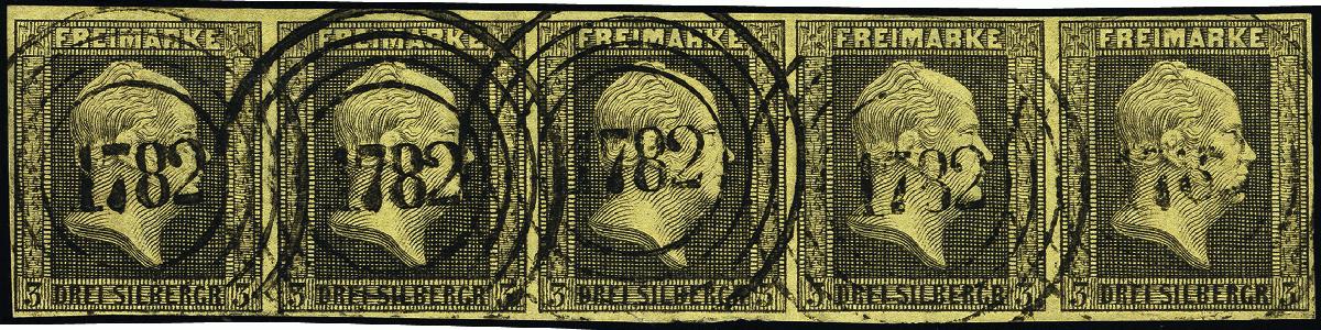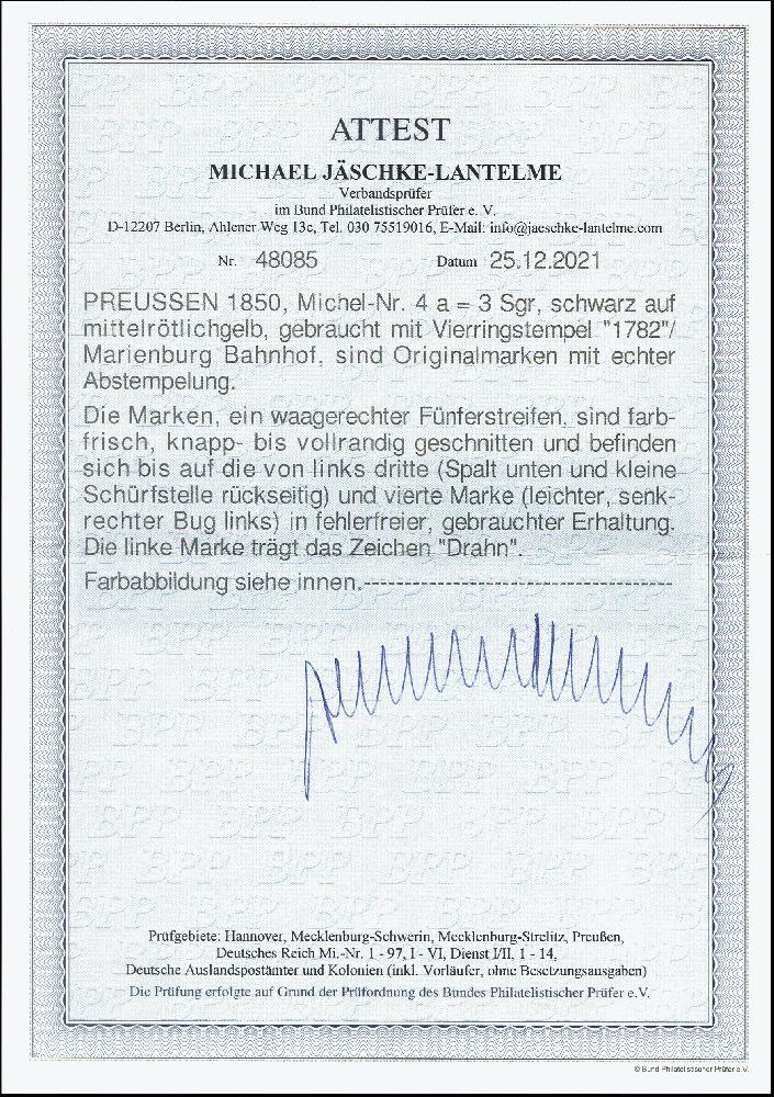 | Zusatzinformationen und Suchstichworte: | 378. Auktion Heinrich Köhler Auktionstermin 21.-26. März 2022 Los 142 3 Silbergroschen schwarz auf gelb im waagerechten Fünferstreifen, voll- bis breitbandig und farbfrisch, mit jeweils meist klar aufgesetzter Nr. „1782“ MARIENBURG BAHNHOF. Die mittlere Marke geschlossener Randspalt am unteren Rand und rückseitig minimale Schürfung, die zweite Marke von rechts unmerkliche Bugspur, sonst einwandfrei. Fotoattest Jäschke-Lantelme BPP (2021) Ausruf 300,00 EUR Zuschlag 460,00 EUR (aus der Sammlung Erivan Haub) |