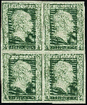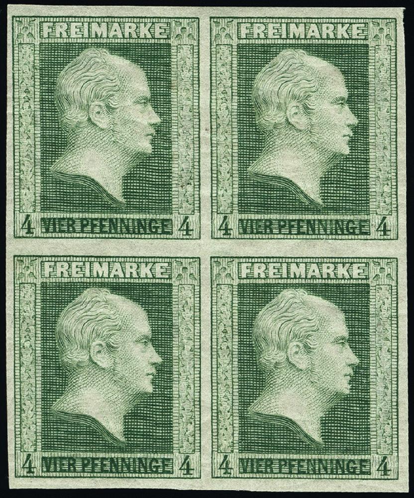 | Zusatzinformationen und Suchstichworte: | 378. Auktion Heinrich Köhler Auktionstermin 21.-26. März 2022 Los 144 4 Pfennige grün im Viererblock, farbfrisch in dunkler Nuance und voll- bis meist breitrandig, postfrisch in tadelloser Erhaltung. Je ein Wert kleine Bleistiftnotiz bzw. rote Signatur; Fotoattest Jäschke-Lantelme BPP (2021) Ausruf 800,00 EUR Zuschlag 1.600,00 EUR (aus der Sammlung Erivan Haub) |